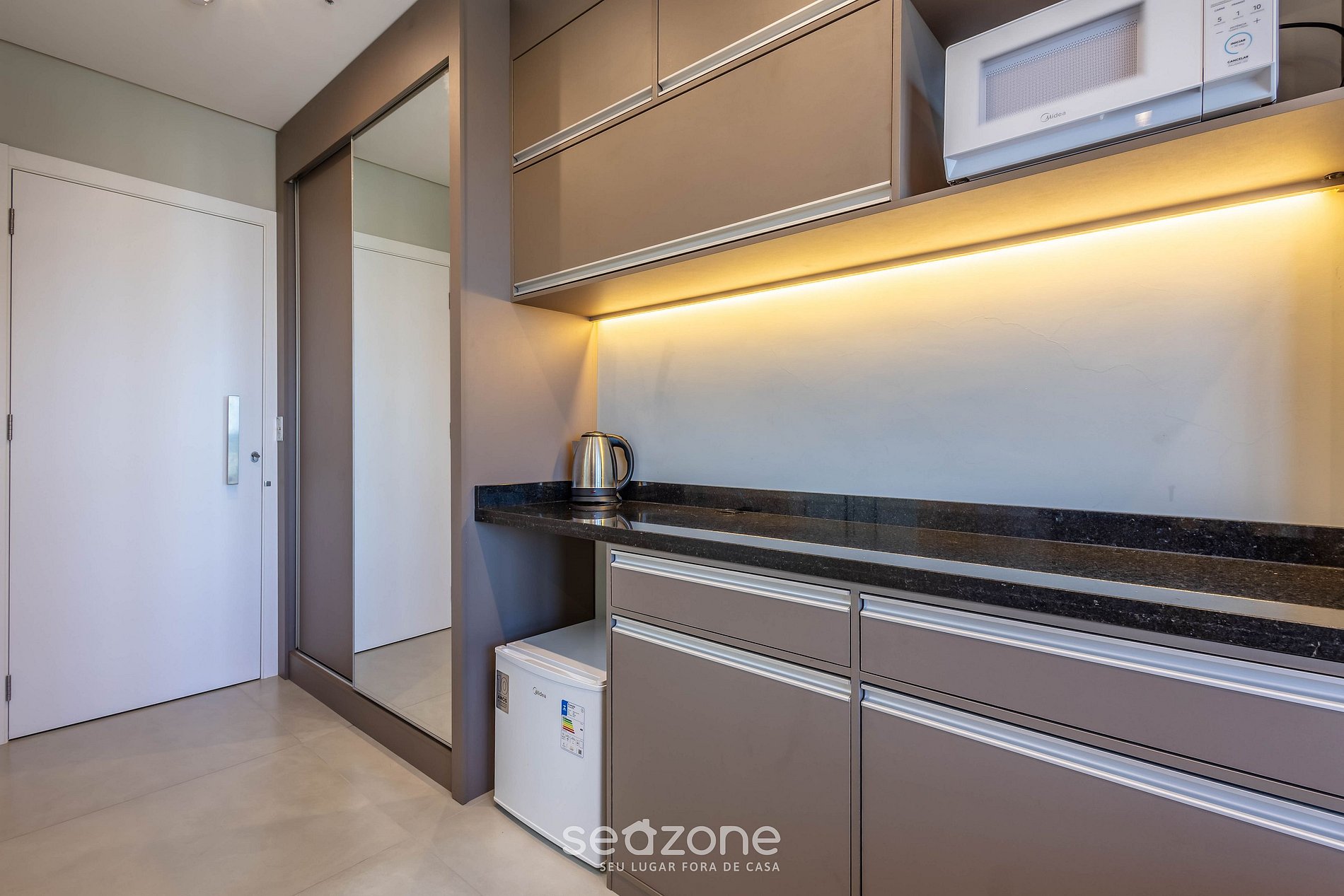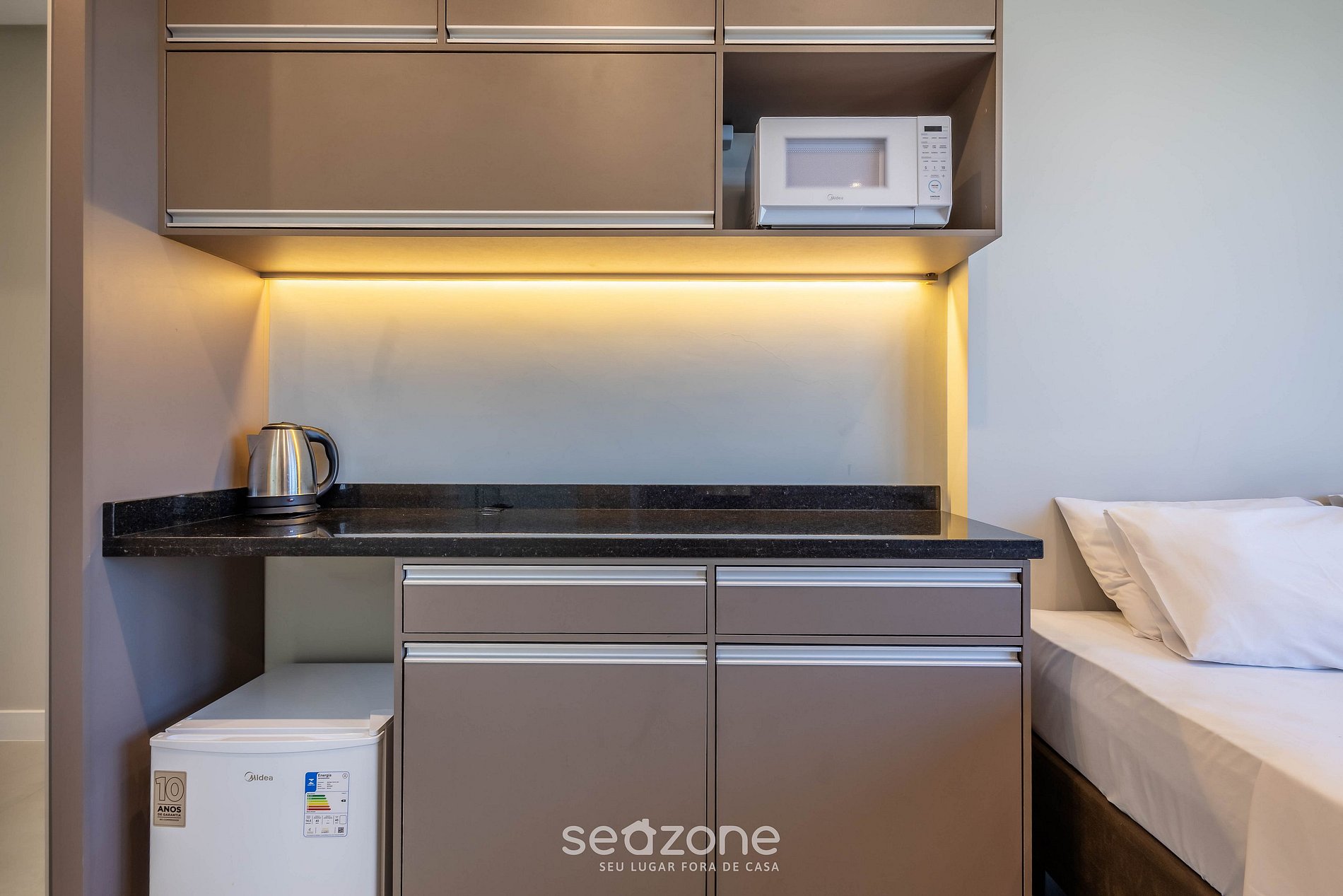 - Cocina compacta con microondas, mininevera, cafetera eléctrica, hervidor eléctrico, copas de vino, vajilla y utensilios básicos de uso diario;