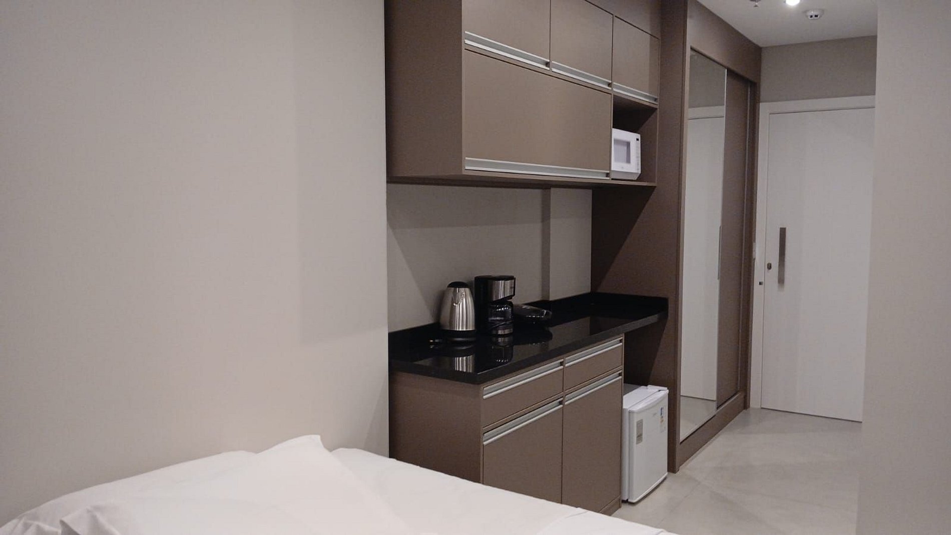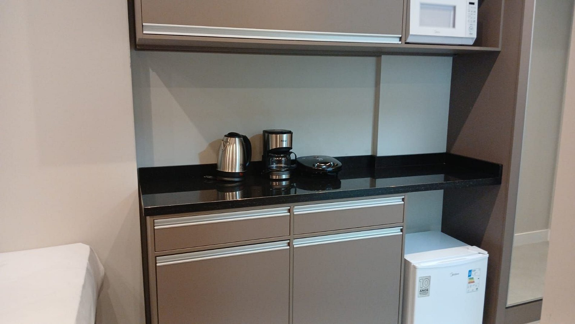 - Cocina compacta con microondas (su opción práctica para comidas rápidas durante la estadía), además de frigobar, cafetera, hervidor eléctrico, copas de vino, vajilla y utensilios esenciales para el día a día;