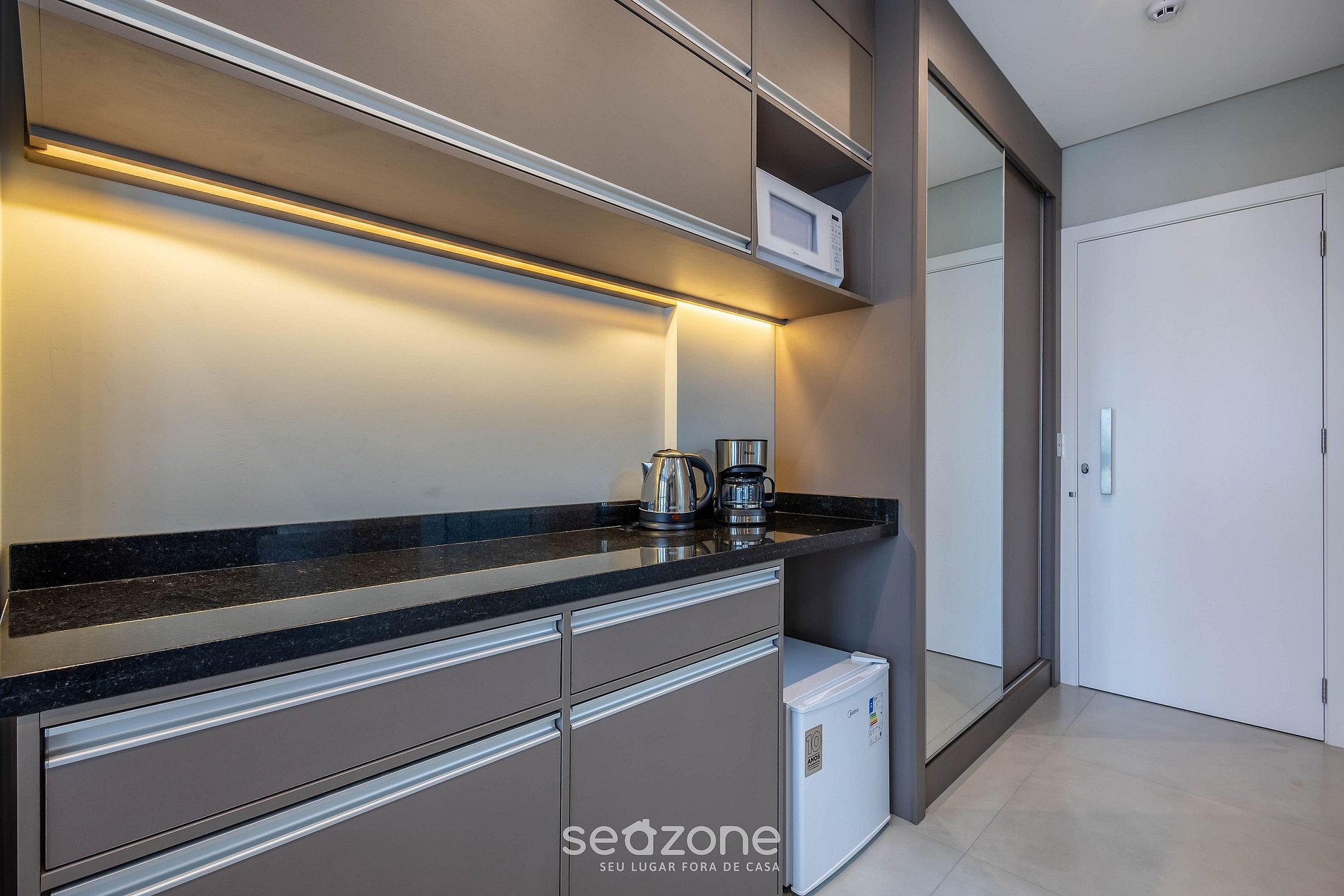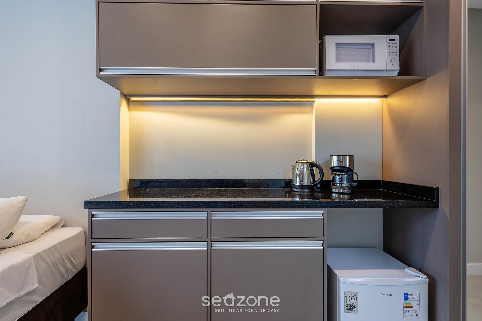 - Cocina compacta con microondas (su opción práctica para comidas rápidas durante la estadía), además de frigobar, cafetera, hervidor eléctrico, copas de vino, vajilla y utensilios esenciales para el día a día;