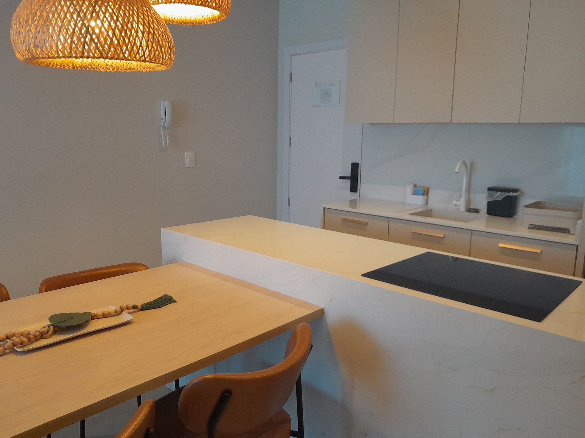 - Cocina completa con nevera, placa de inducción, microondas, sandwichera, licuadora, cafetera eléctrica, hervidor, copas de vino, ollas, vajilla y utensilios;