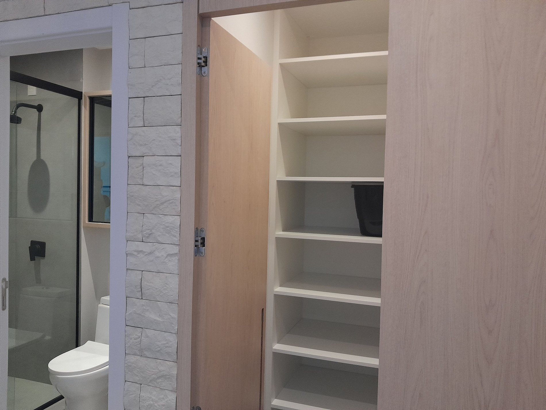 - 1 dormitorio con cama queen, armario, perchero para ropa y aire acondicionado;