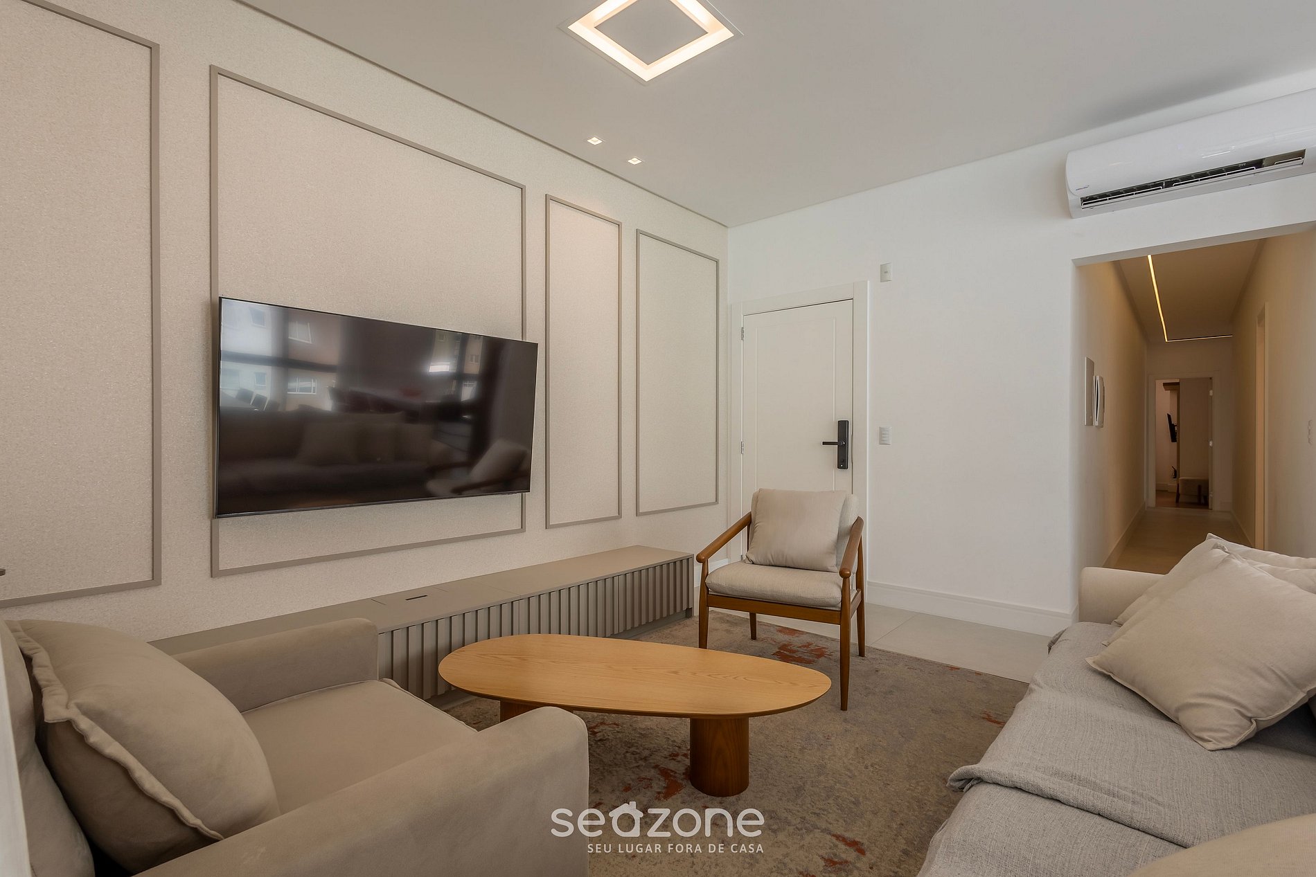 - Sala de estar con sofá, sillón, Smart TV y aire acondicionado;