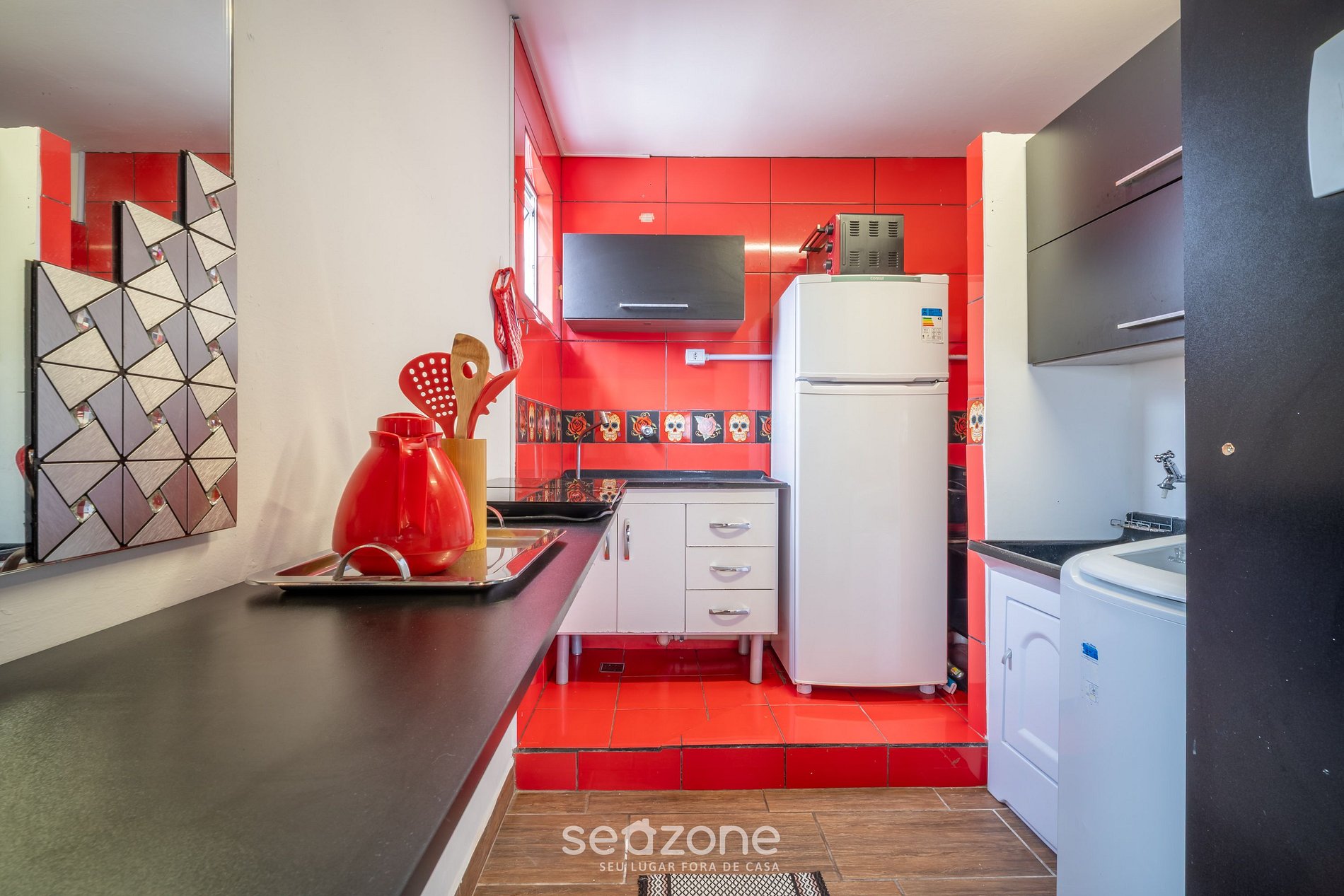 - Cocina totalmente equipada con refrigerador, cocina cooktop, horno eléctrico, microondas, sandwichera, kit de café (soporte para filtro y termo), hervidor, licuadora, copas de vino, ollas, vajilla y utensilios;