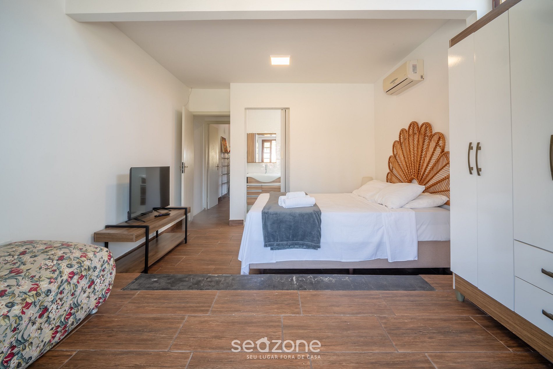 - 1 suite con cama queen, TV, armario y aire acondicionado;