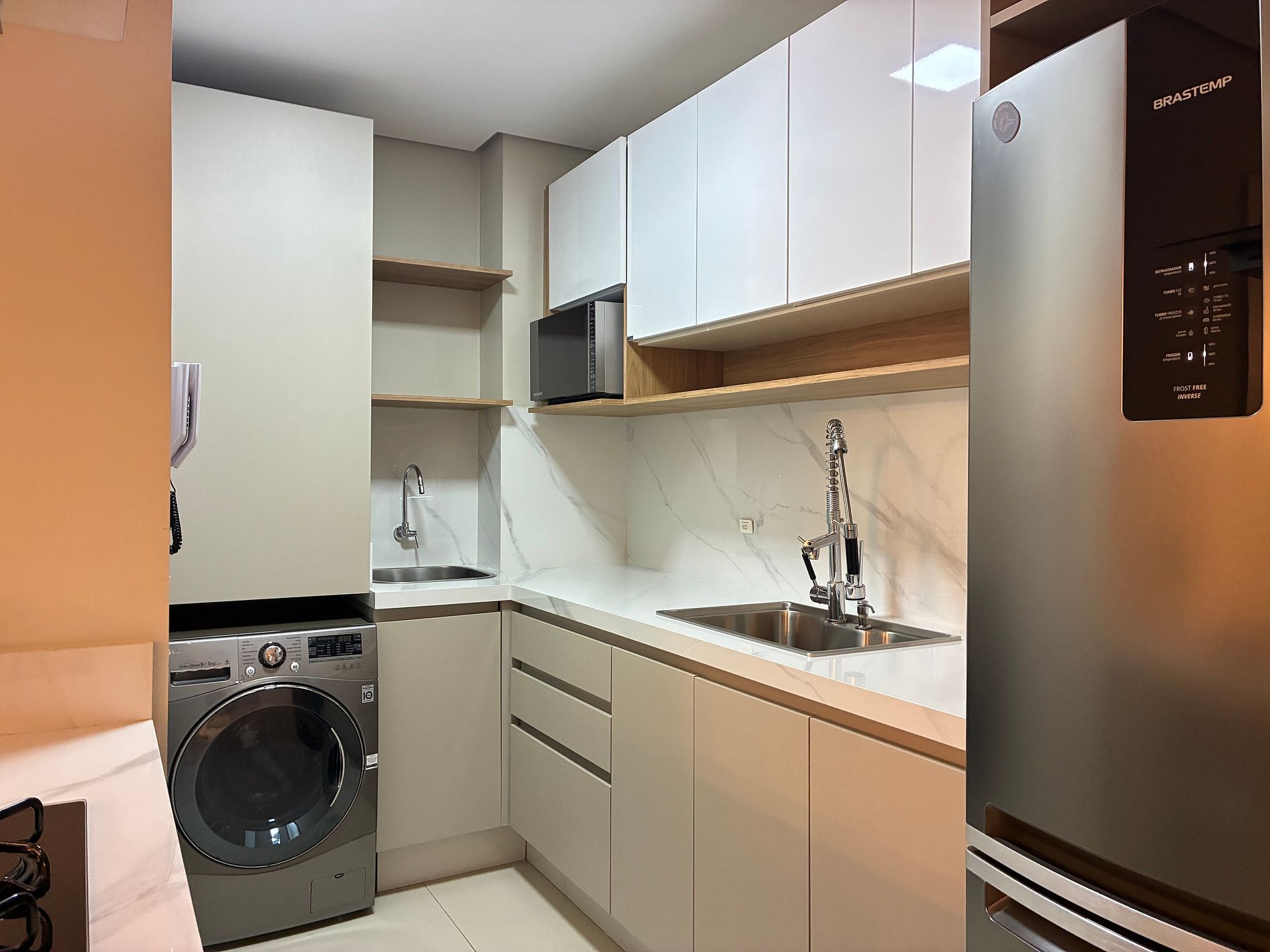 - Cocina totalmente equipada con refrigerador, estufa de gas, horno eléctrico, microondas, sandwichera, hervidor, licuadora, copas de vino, ollas, sartenes, platos y utensilios;