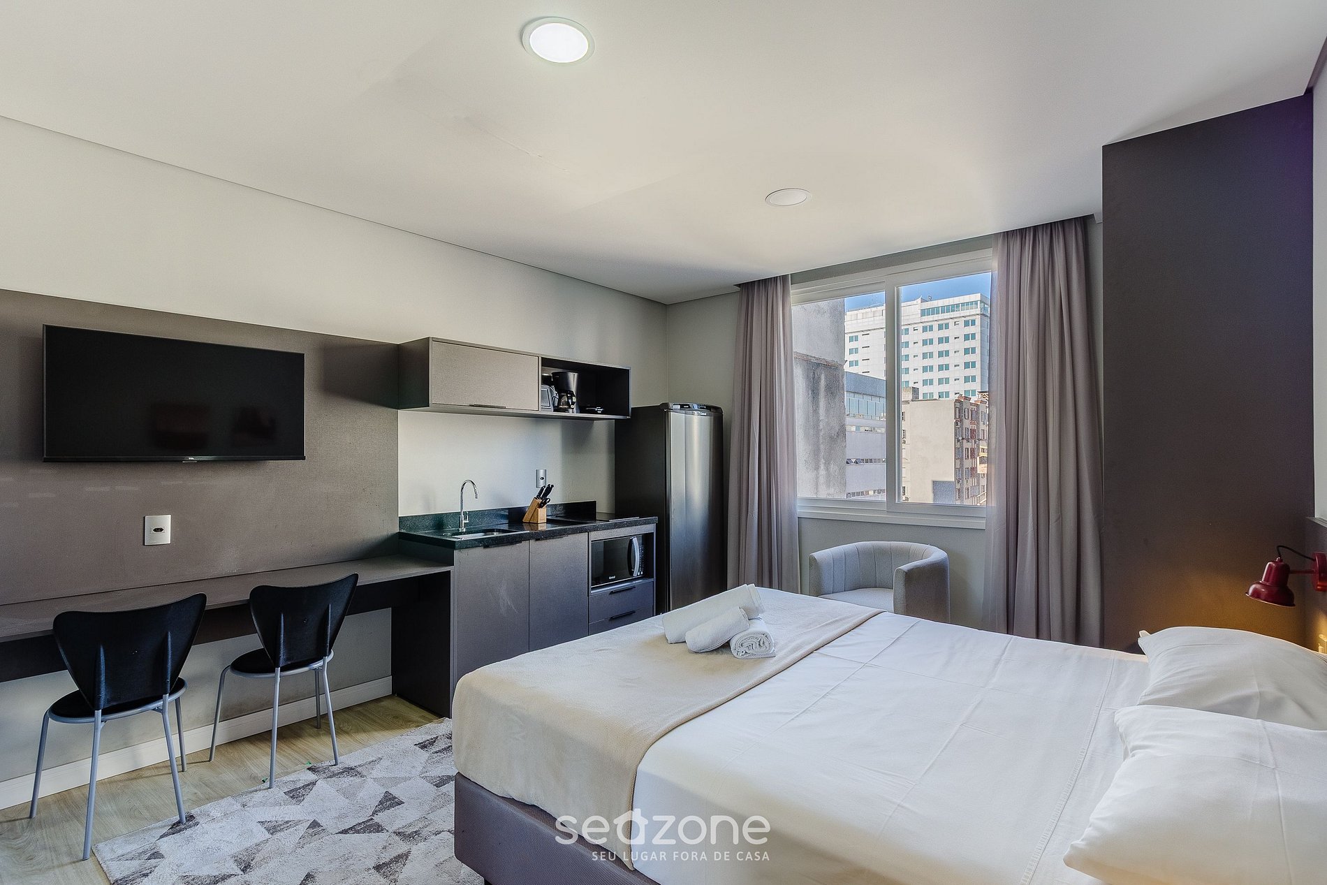 Explore el encanto del Centro Histórico de Porto Alegre mientras disfruta del confort y la conveniencia de nuestros estudios totalmente equipados en un condominio con una atractiva piscina.