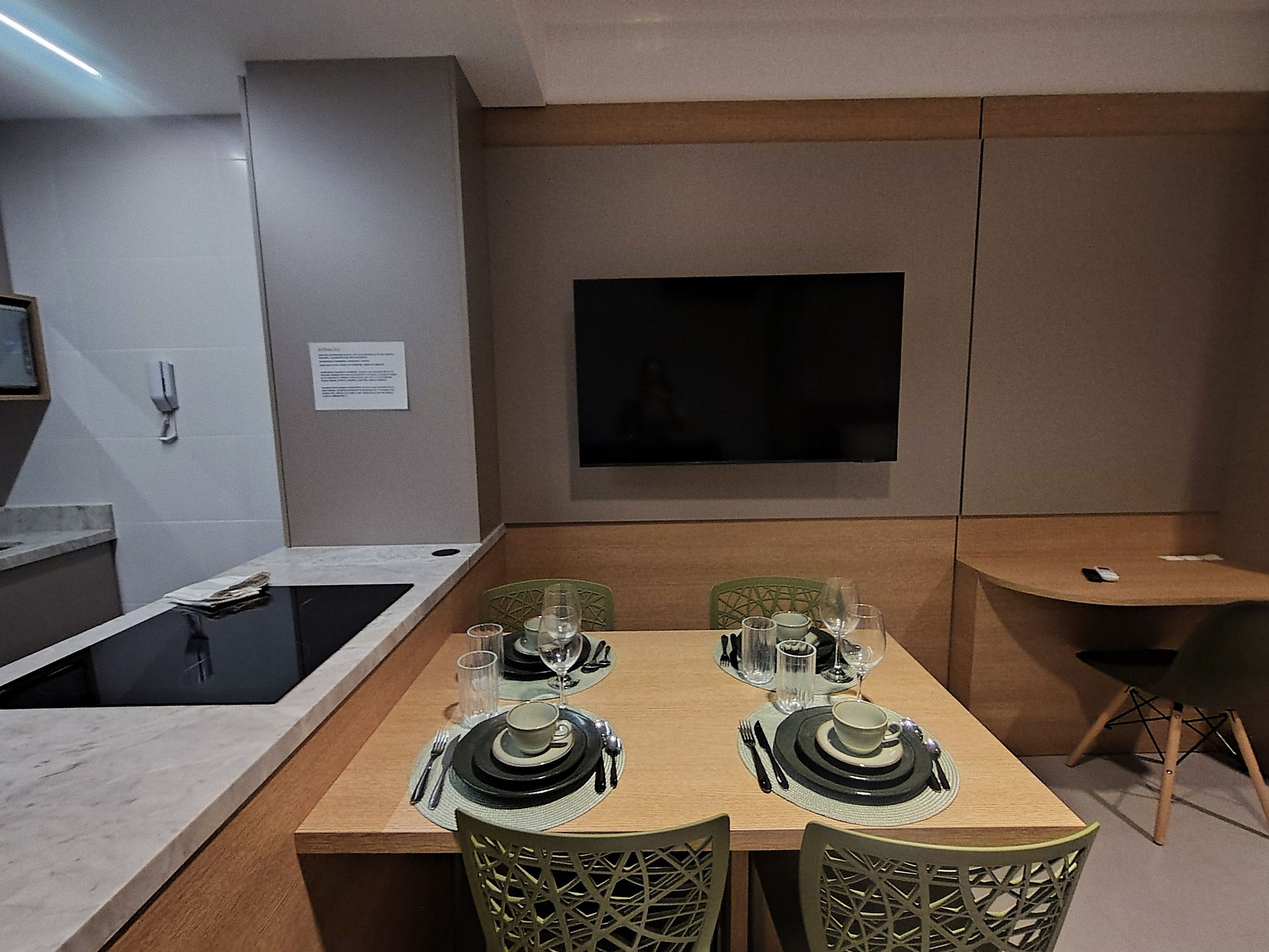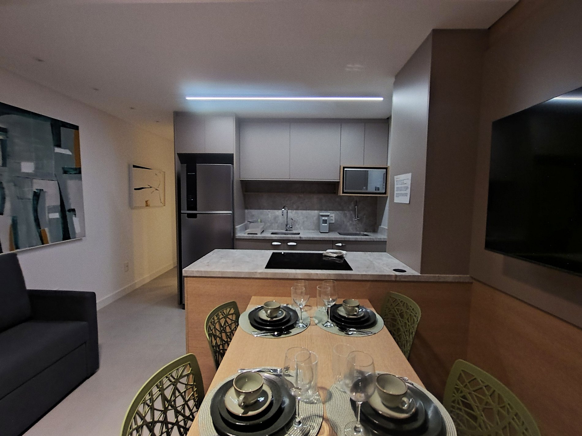 Cocina completa con refrigerador, placa de inducción, horno eléctrico, microondas, sandwichera, kit de café (soporte para filtro y termo), hervidor eléctrico, licuadora, copas de vino, ollas, vajilla y utensilios;