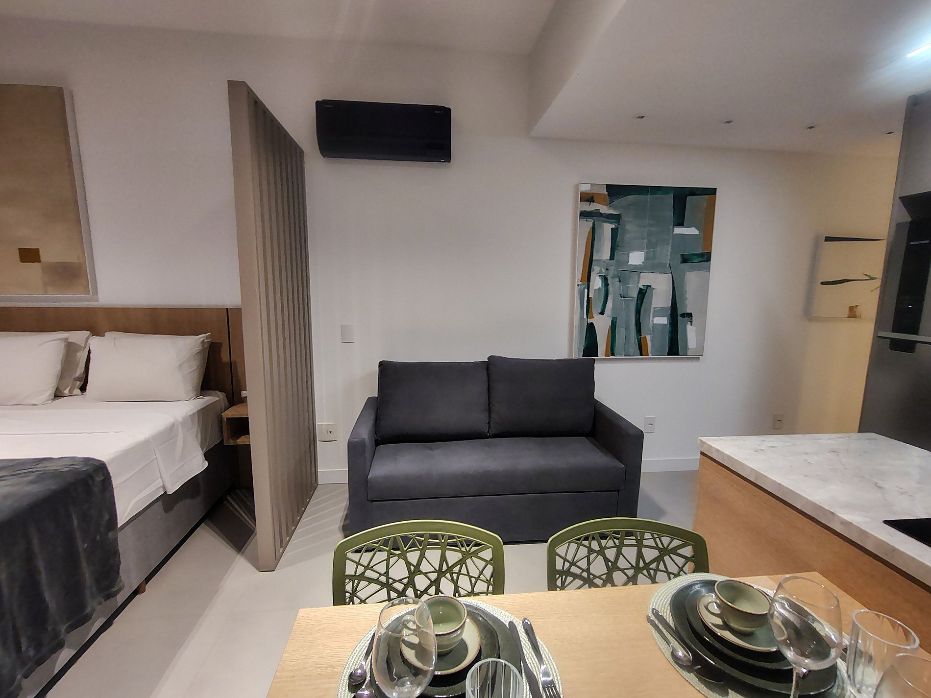Cama queen, sofá cama matrimonial, Smart TV, armario y aire acondicionado;