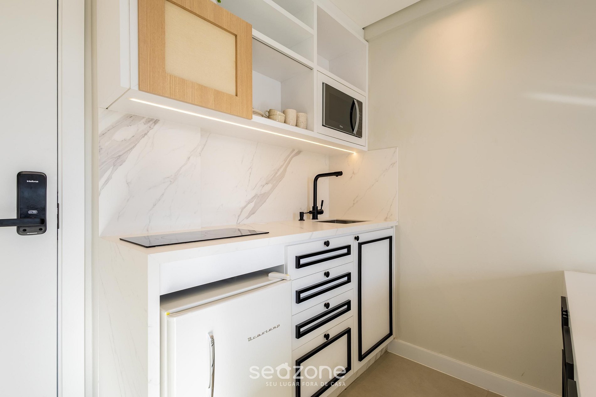 Cocina totalmente equipada con frigobar, cooktop de inducción, microondas, sandwichera, cafetera eléctrica, hervidor eléctrico, licuadora, copas de vino, ollas, vajilla y utensilios;