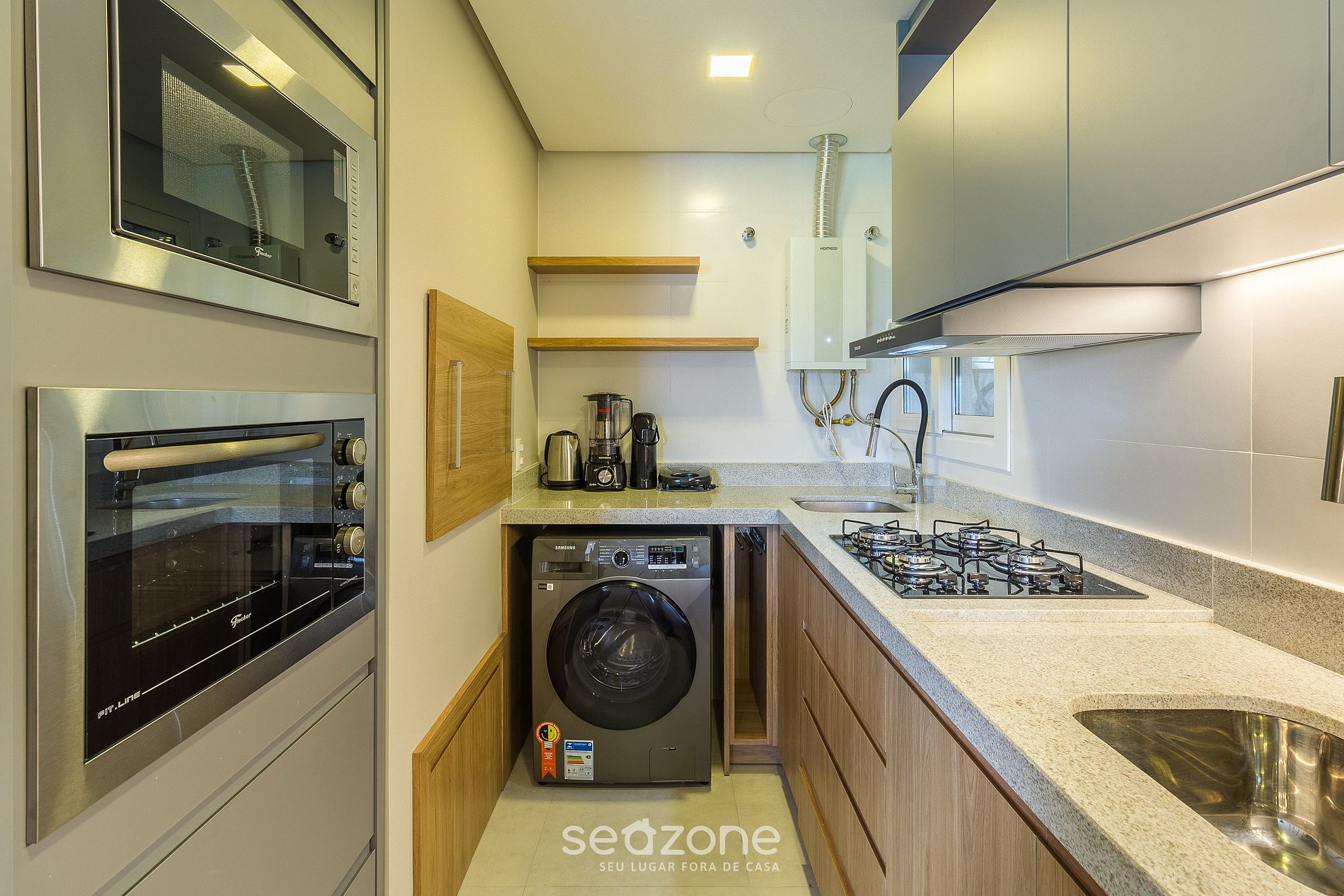 - Cocina totalmente equipada con refrigerador, placa de gas, horno eléctrico, microondas, sandwichera, kit de café (portafiltro, termo), hervidor eléctrico, licuadora, copas de vino, ollas, platos y utensilios;