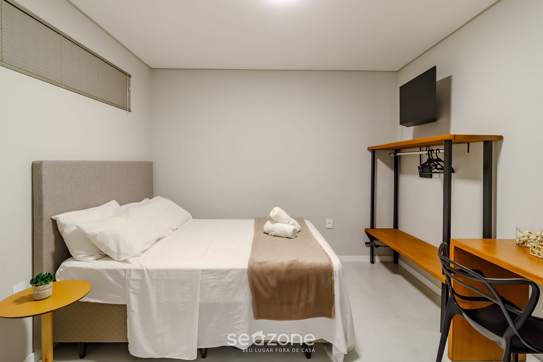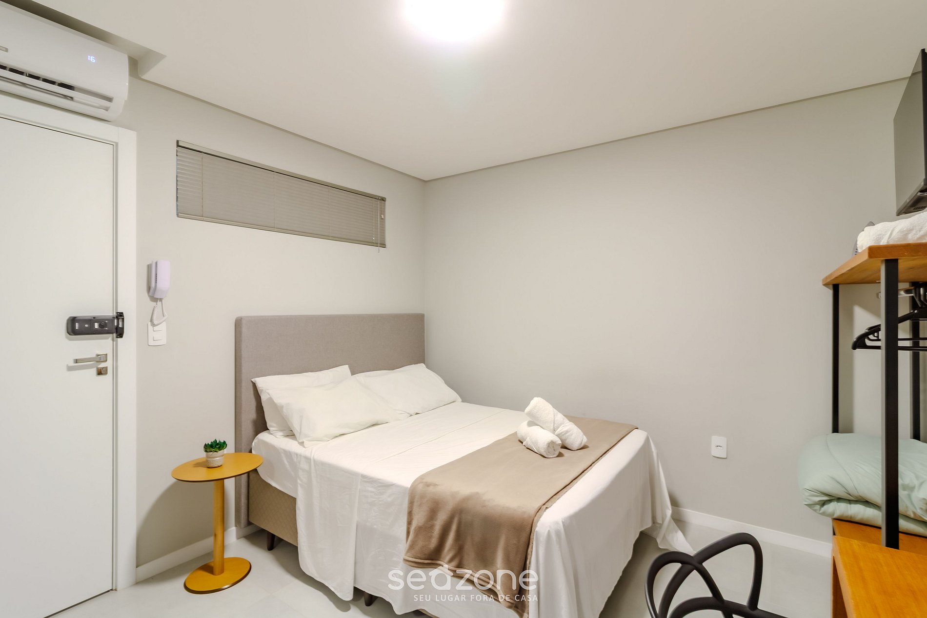 - Cama doble, perchero, Smart TV y aire acondicionado;