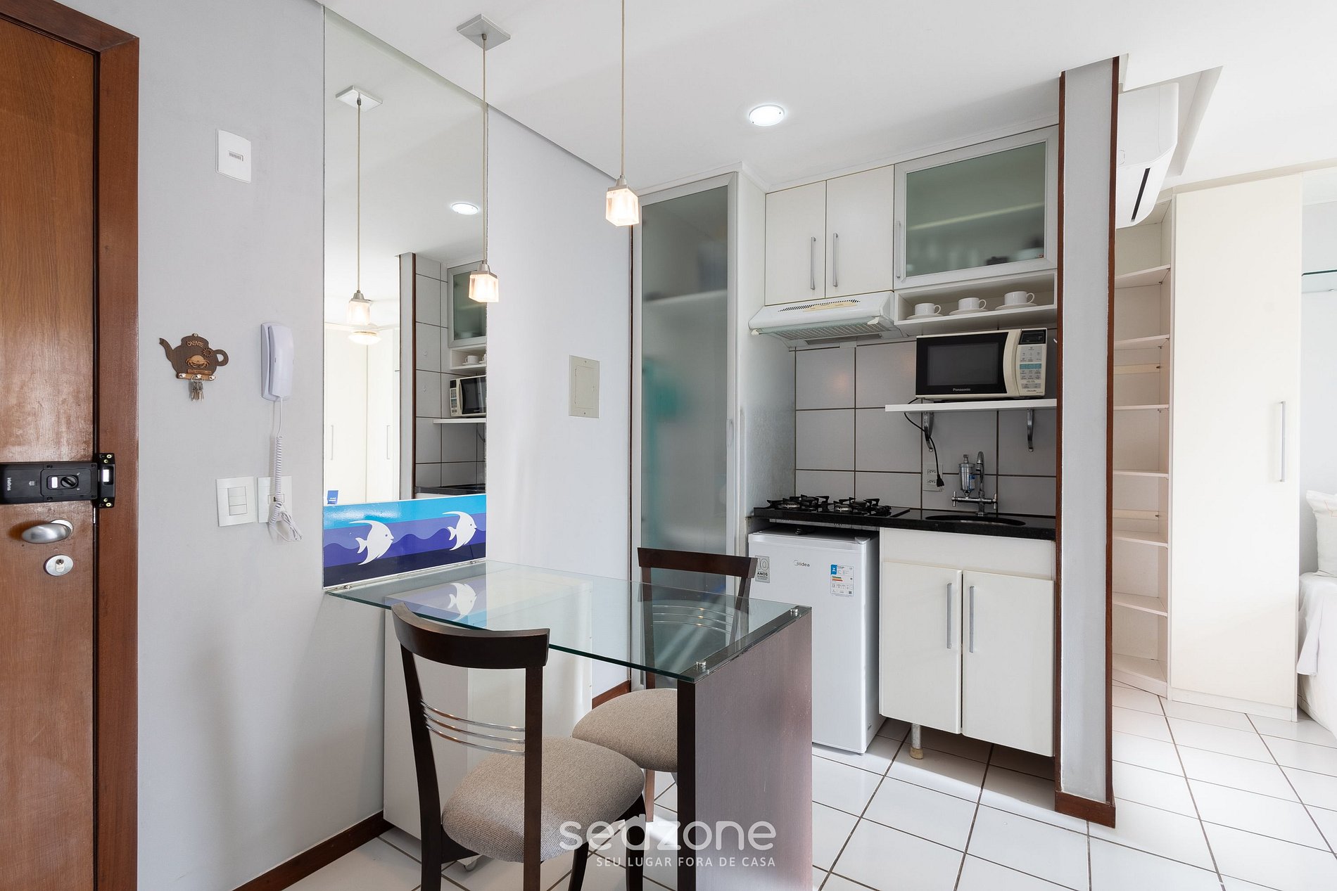 - Cocina totalmente equipada con mininevera, placa de gas, microondas, sandwichera, hervidor de agua, copas de vino, ollas, sartenes, platos y utensilios;
