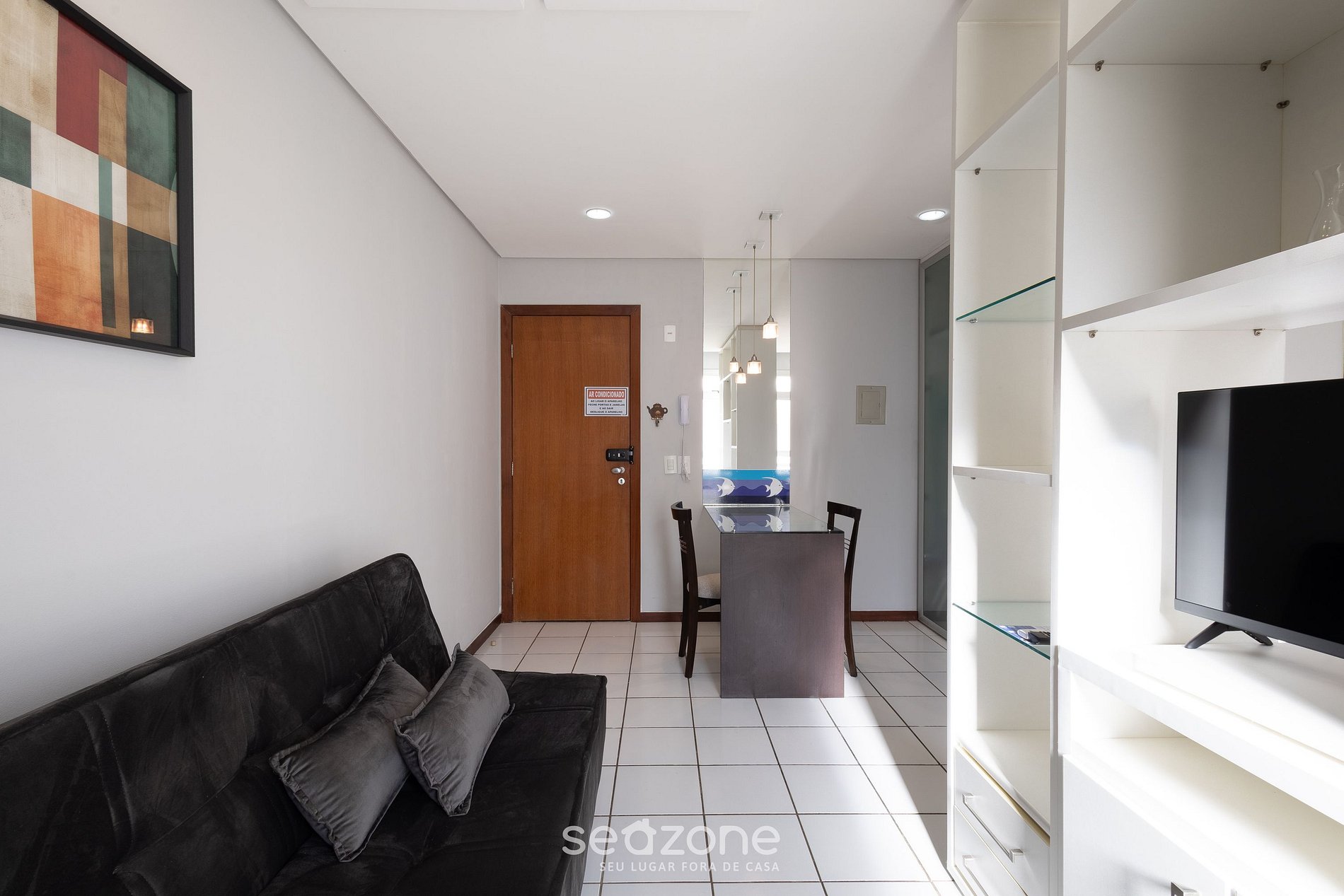 - Cama doble, sofá cama individual, armario, Smart TV, espacio para portátil y aire acondicionado;