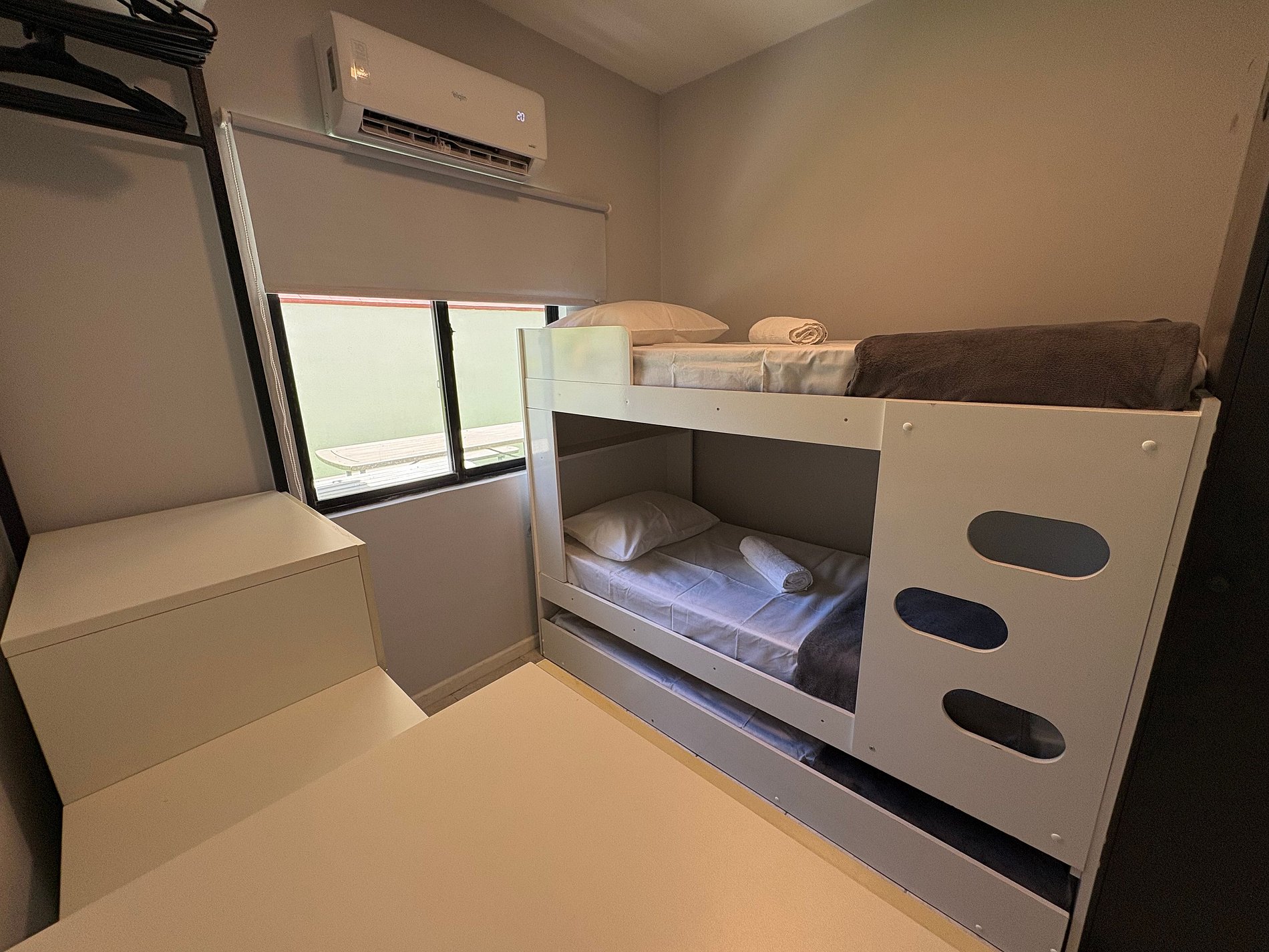 - 1 Dormitorio con 1 litera individual, 1 cama supletoria individual, perchero y aire acondicionado;