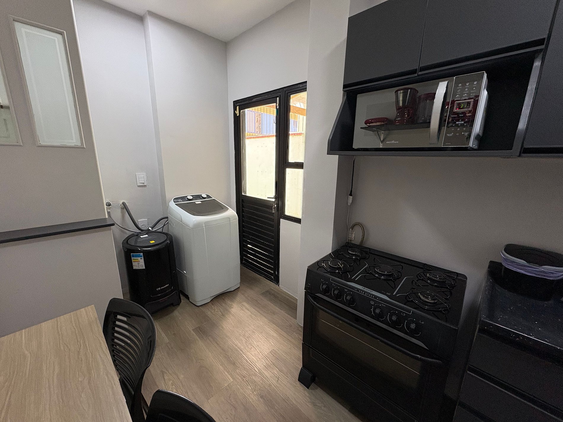 - Cocina totalmente equipada con refrigerador, estufa de gas y horno, microondas, sandwichera, cafetera eléctrica, hervidor eléctrico, licuadora, copas de vino, ollas, sartenes, platos y utensilios;