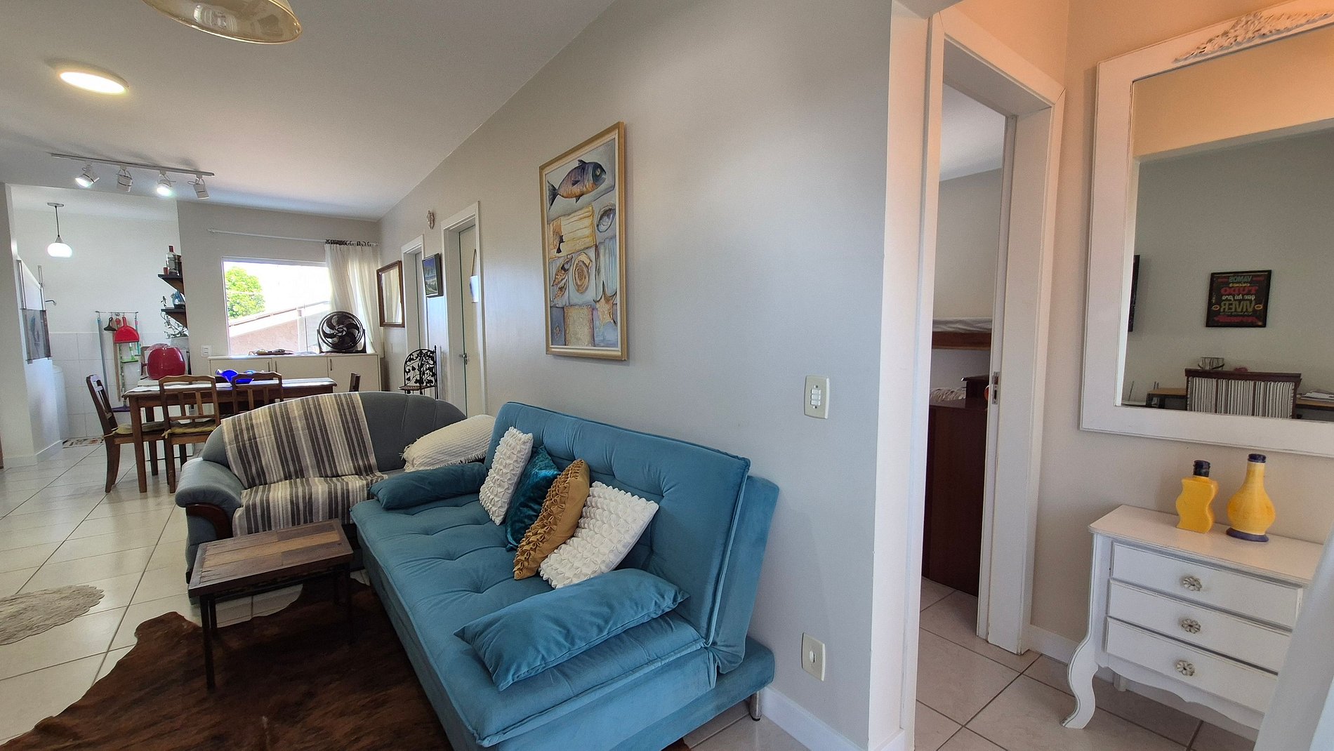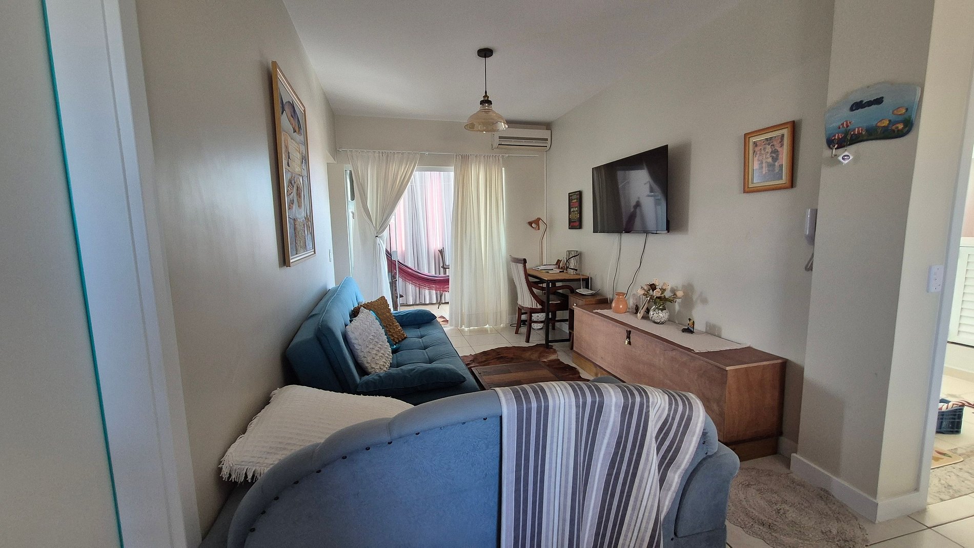 - Sala de estar con sofá, sofá cama, Smart TV y ventilador portátil;