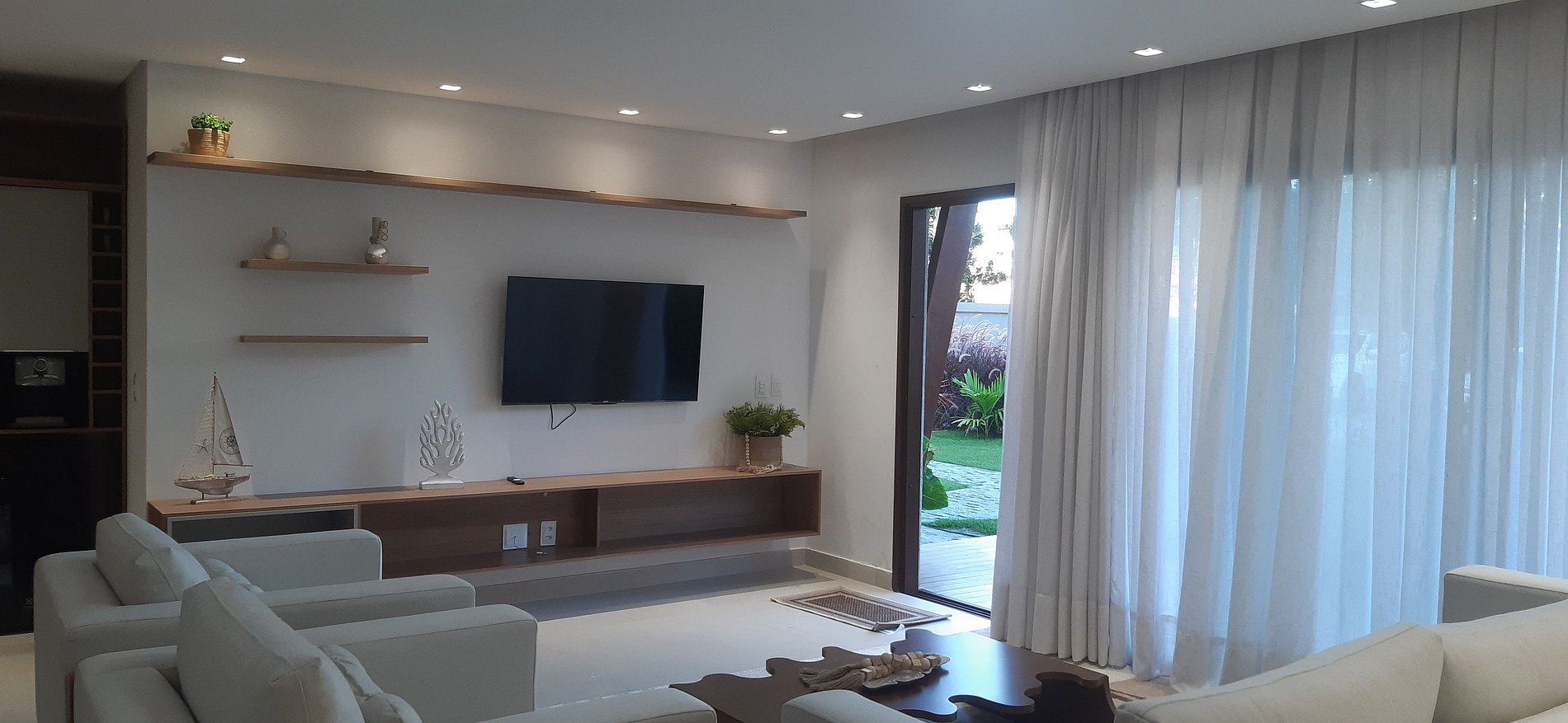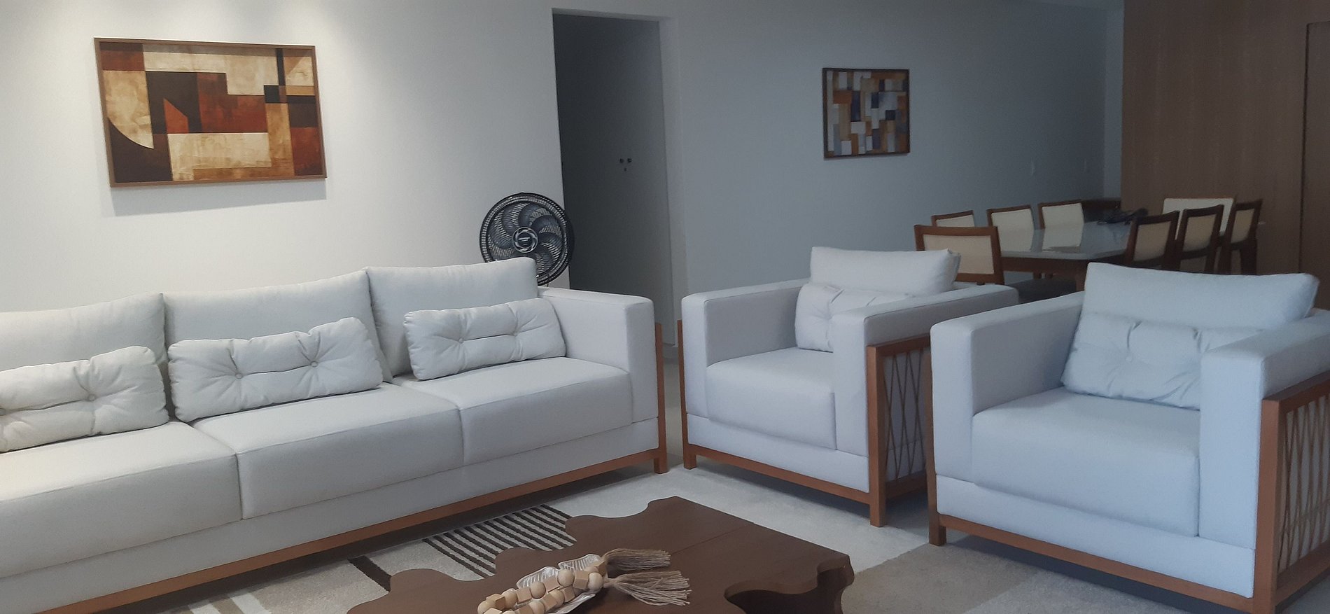 - Sala de estar con sofá, dos sillones, Smart TV y ventilador portátil;