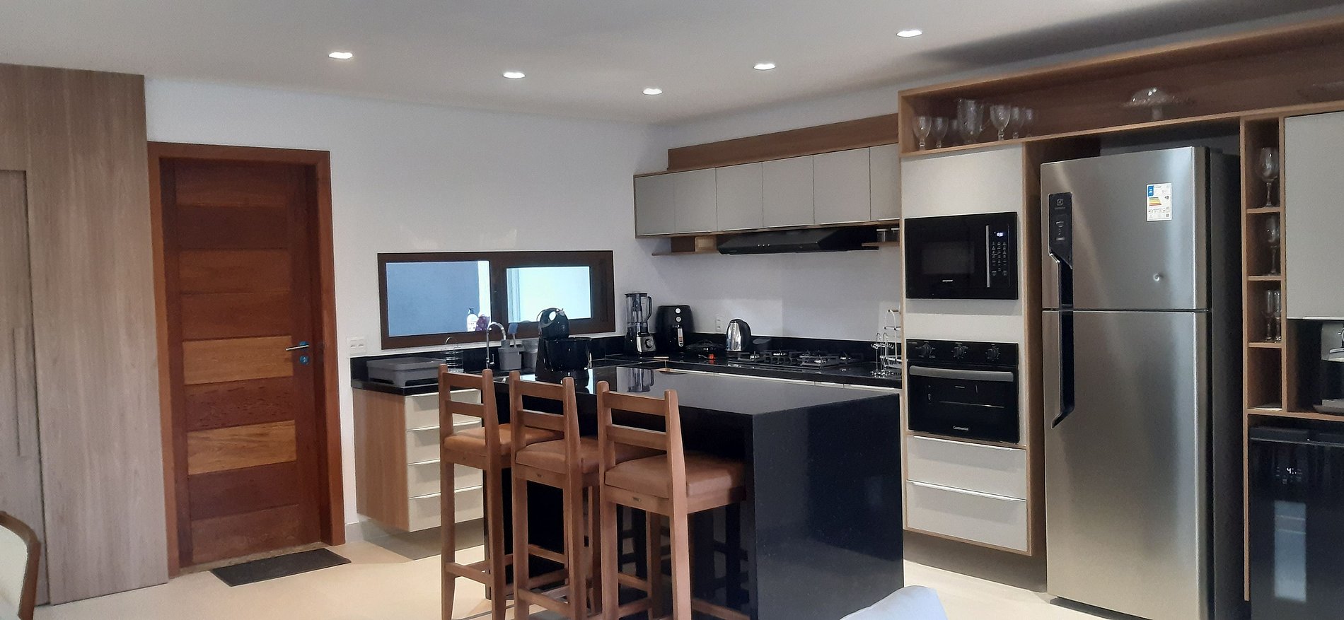 - Cocina totalmente equipada con refrigerador, placa de gas, horno eléctrico, microondas, sandwichera, kit de café (portafiltros, termo), hervidor eléctrico, licuadora, copas de vino, ollas, sartenes, platos y utensilios;