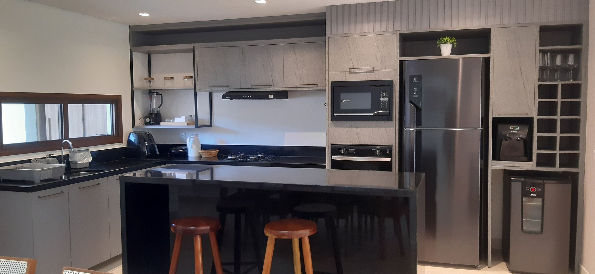 - Cocina totalmente equipada con refrigerador, estufa (de gas), horno eléctrico, microondas, sandwichera, kit de café (portafiltro, termo), licuadora, copas de vino, ollas, sartenes, platos y utensilios;