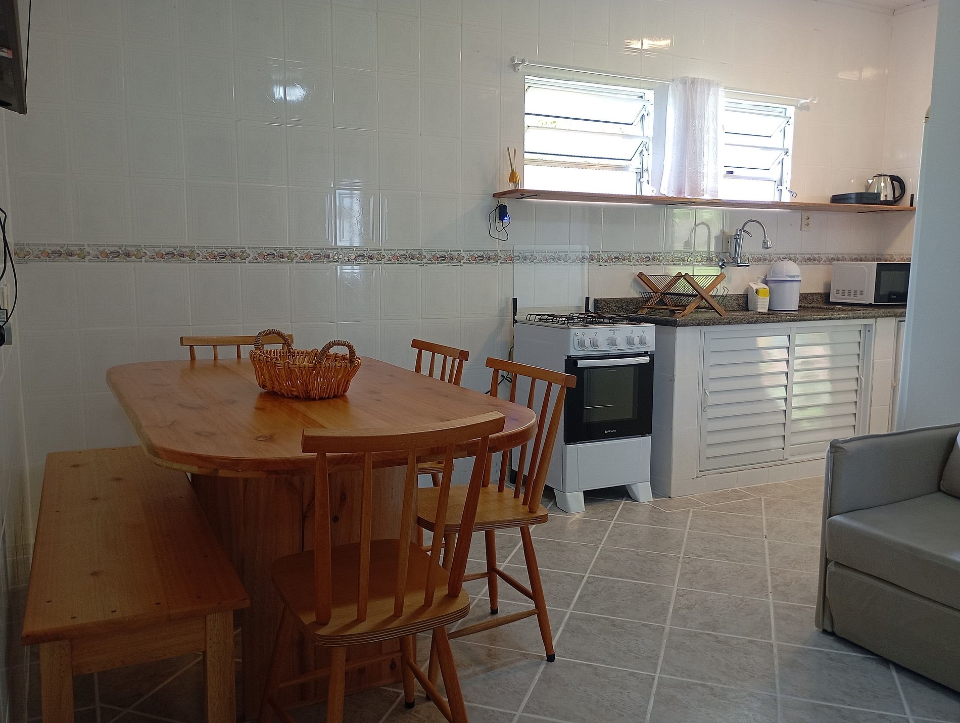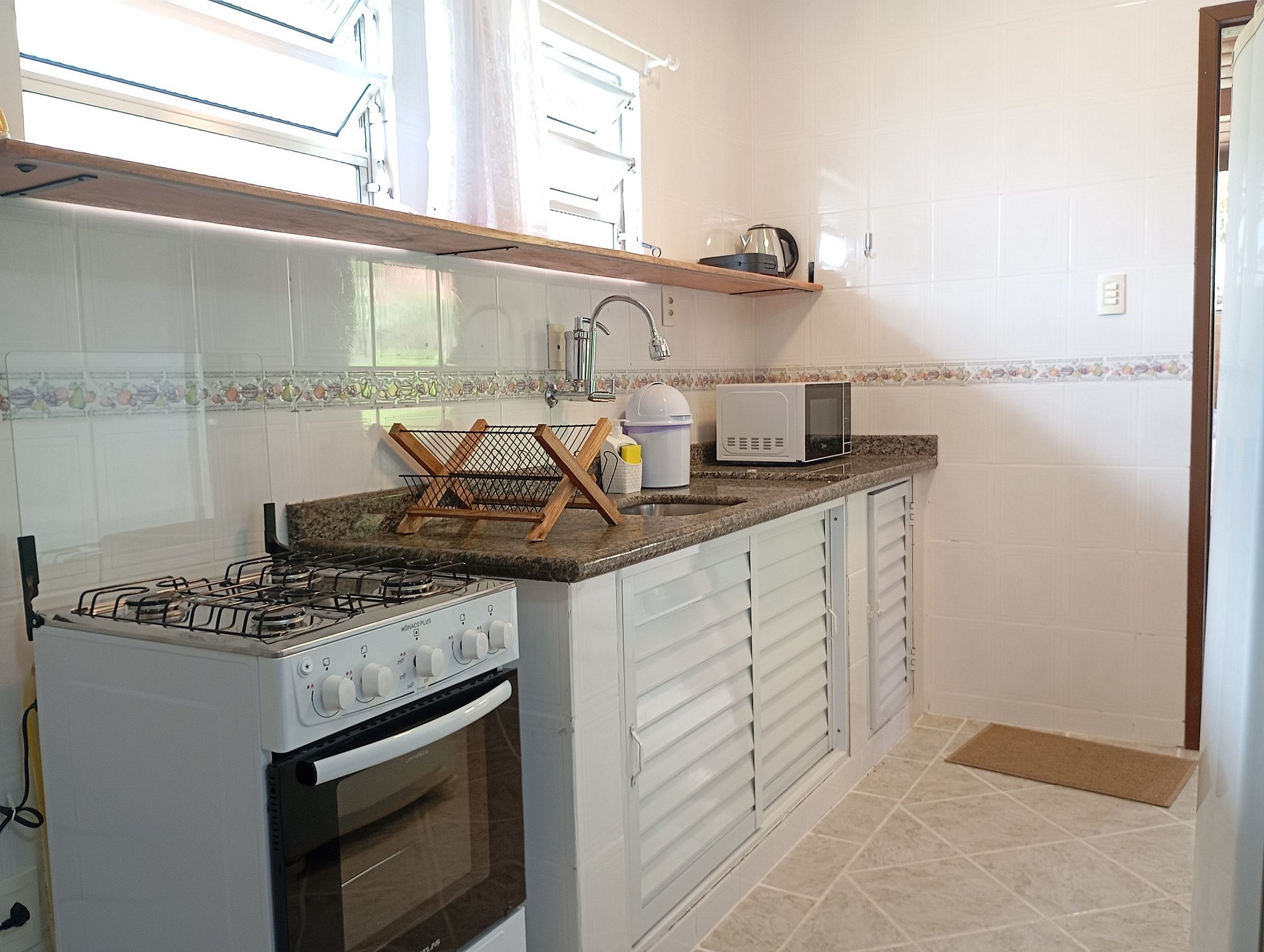 - Cocina totalmente equipada con refrigerador, estufa y horno de gas, microondas, sandwichera, kit de café (portafiltros, termo), hervidor eléctrico, copas de vino, ollas, sartenes, platos y utensilios;