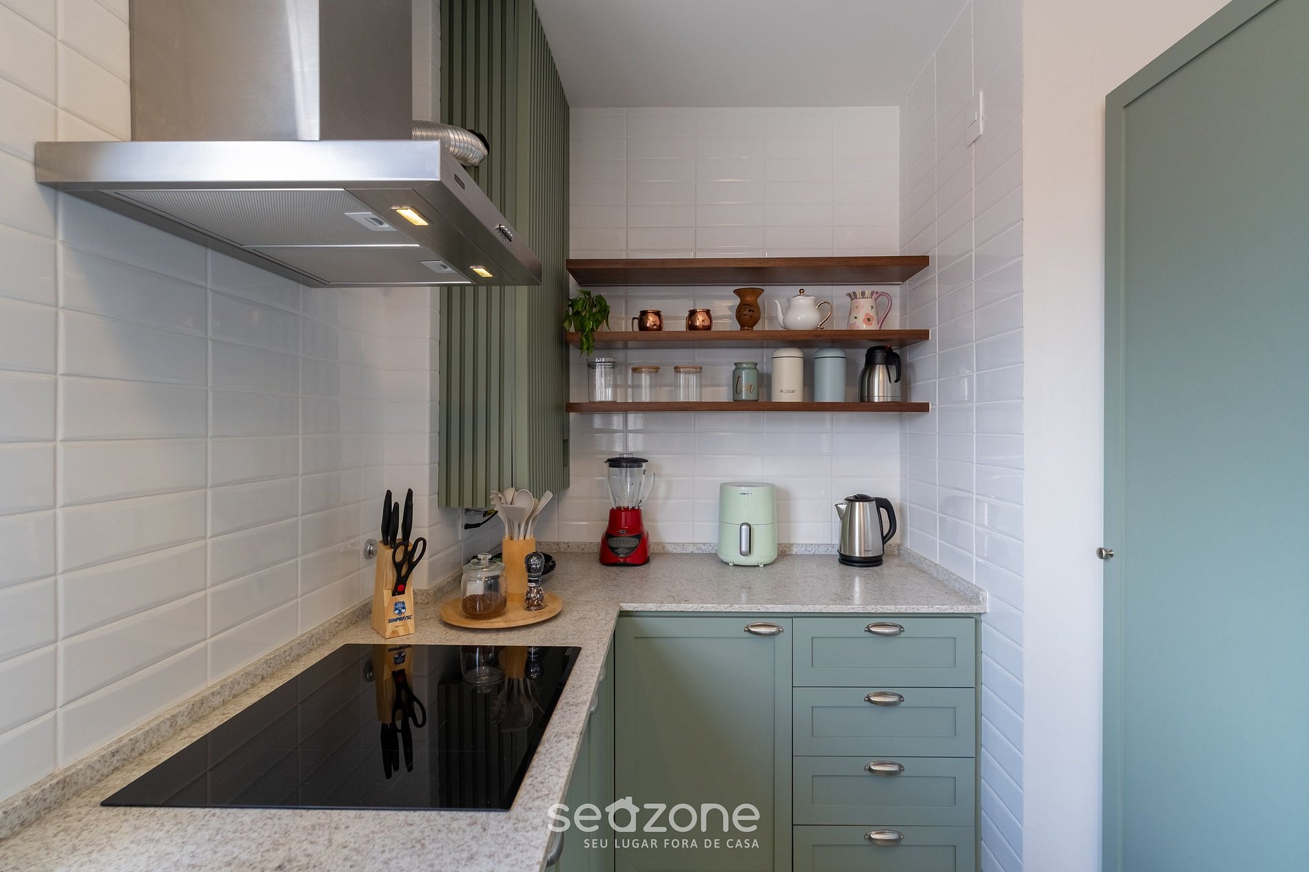 - Cocina totalmente equipada con refrigerador, placa de inducción, horno eléctrico, microondas, hervidor eléctrico, licuadora, campana extractora, freidora de aire, lavavajillas, waflera, copas de vino, ollas, sartenes, platos y utensilios;