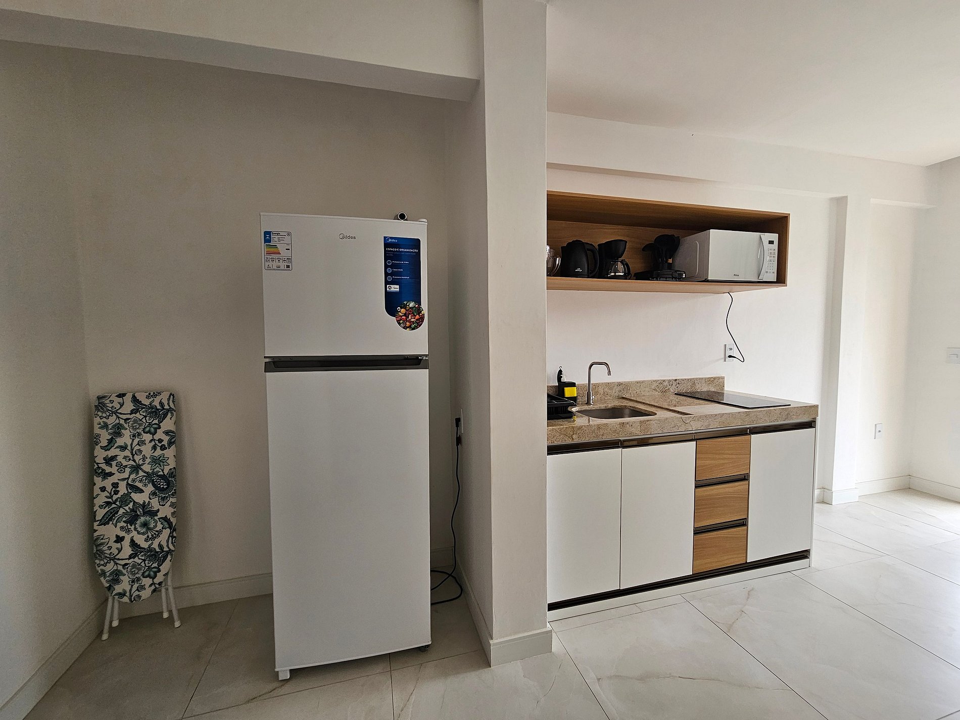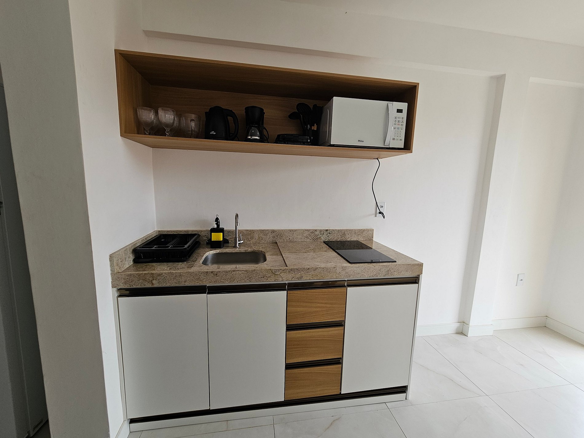 - Cocina totalmente equipada con aire acondicionado, refrigerador, placa de inducción, microondas, sandwichera, cafetera eléctrica, hervidor eléctrico, licuadora, ollas, sartenes, platos y utensilios;