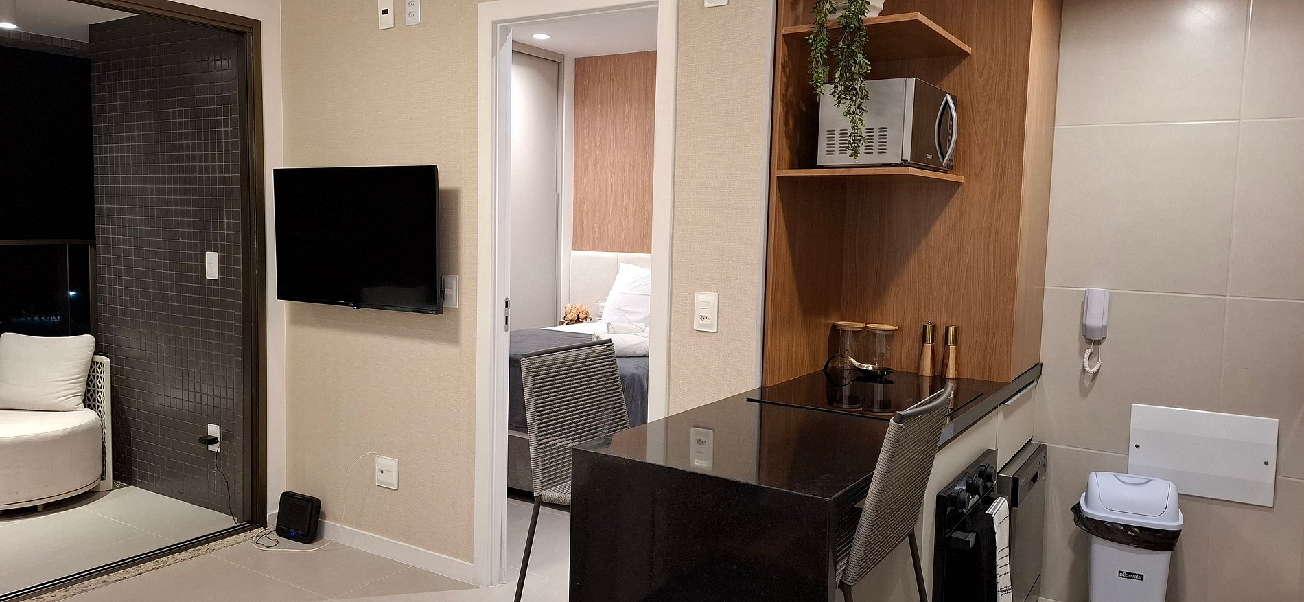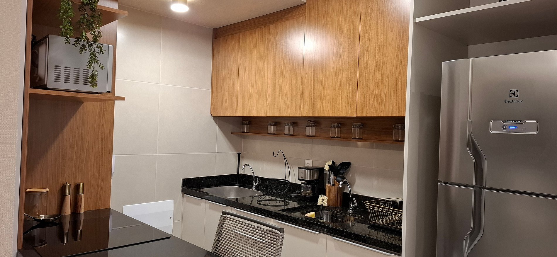 - Cocina totalmente equipada con refrigerador, placa de inducción, horno de gas, microondas, sandwichera, cafetera eléctrica, hervidor, licuadora, lavavajillas, copas de vino, ollas, sartenes, platos y utensilios;