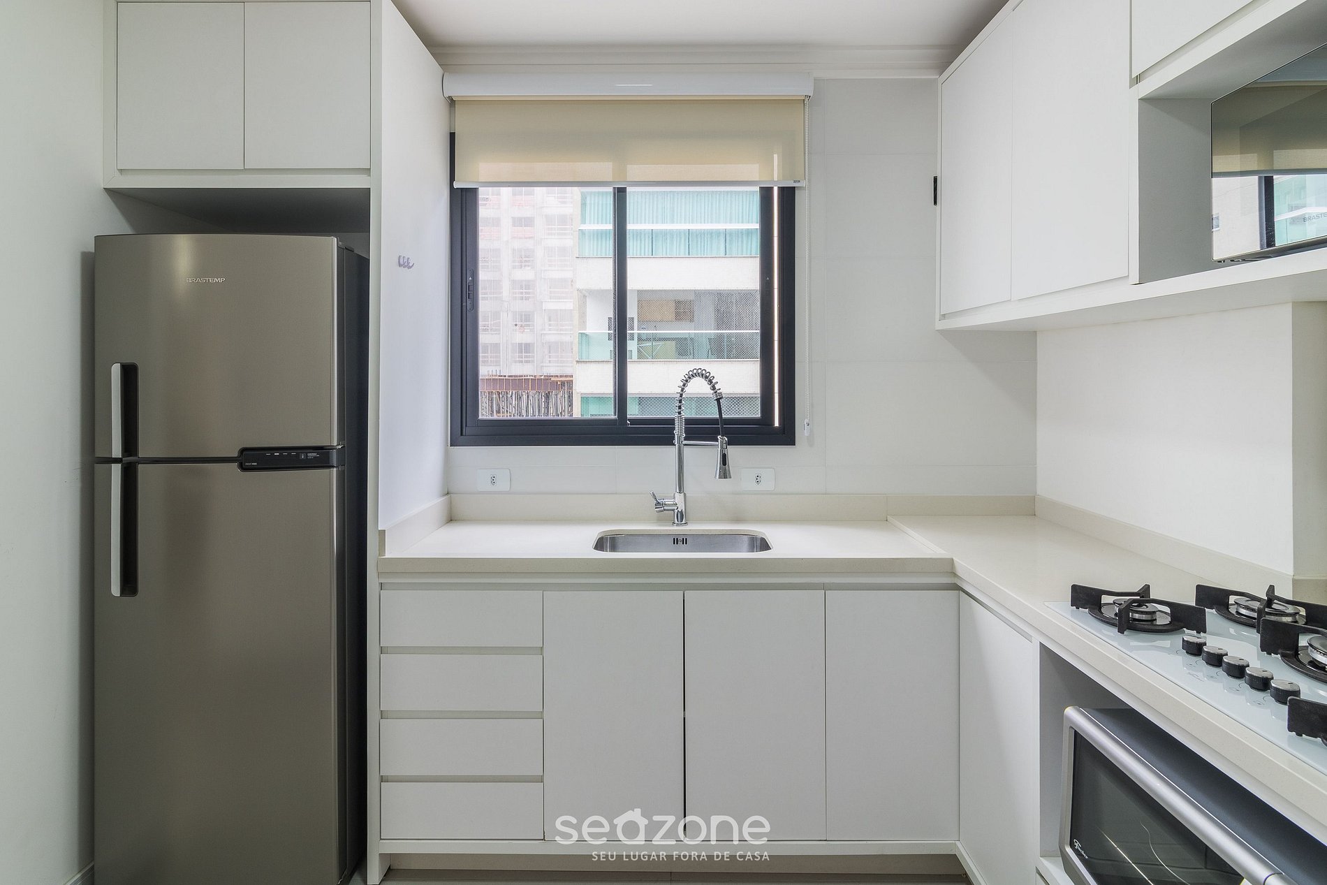 - Cocina totalmente equipada con refrigerador, placa de gas, horno eléctrico, microondas, kit de café (portafiltro, termo), hervidor eléctrico, copas de vino, ollas, platos y utensilios;