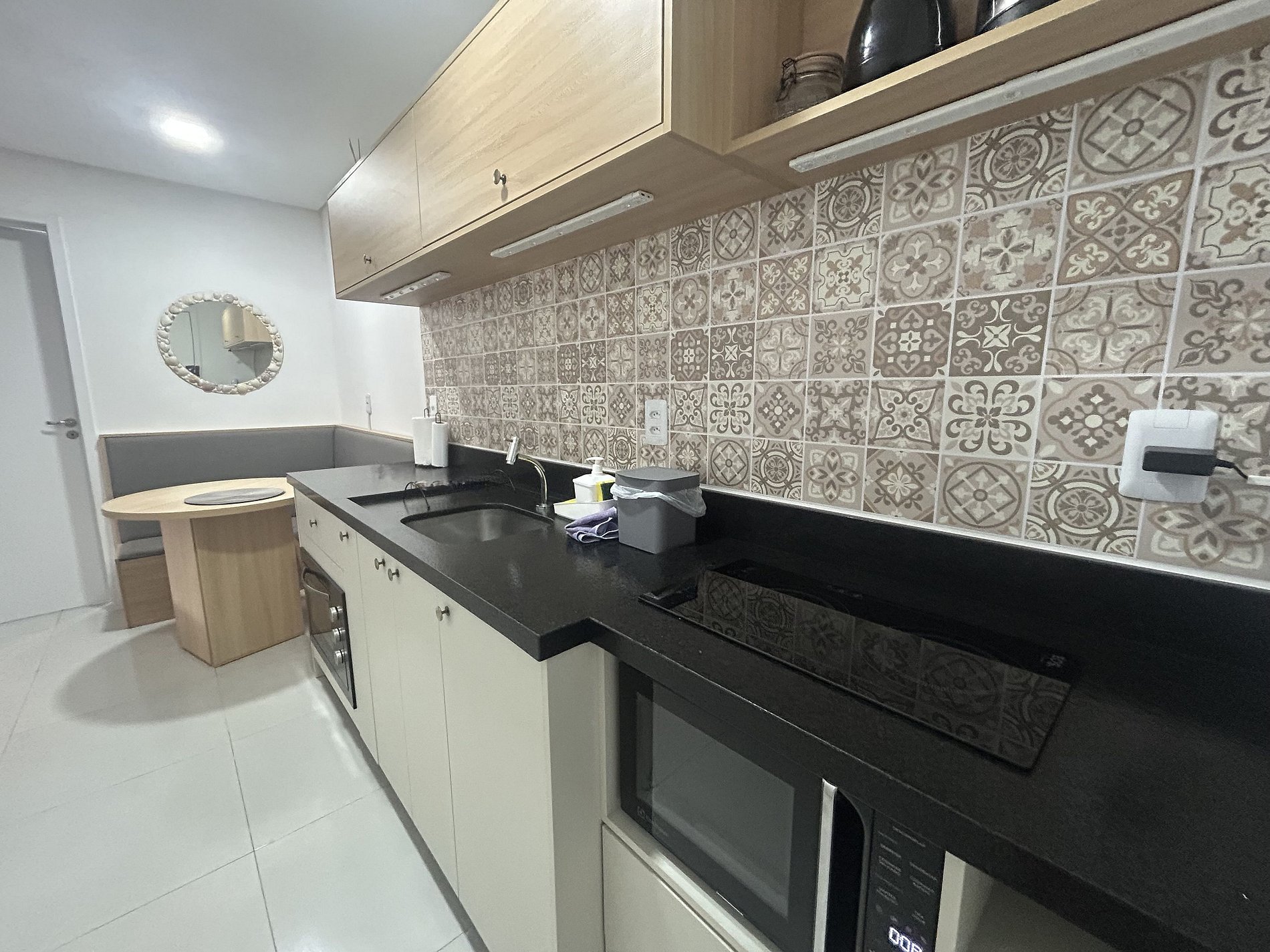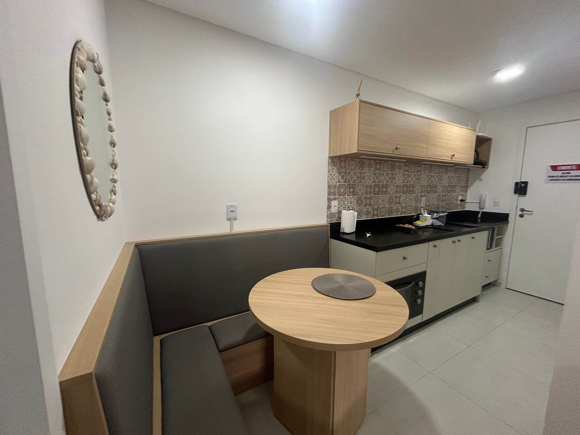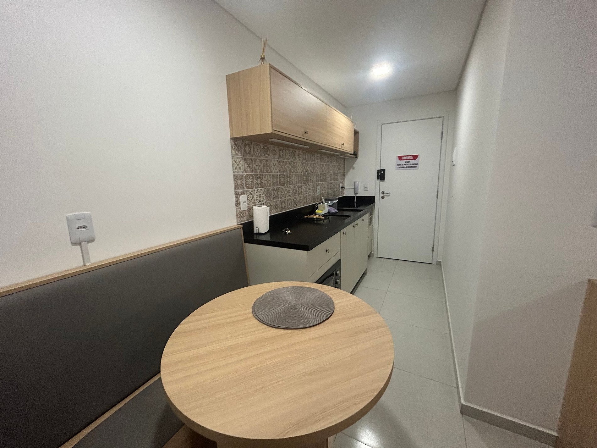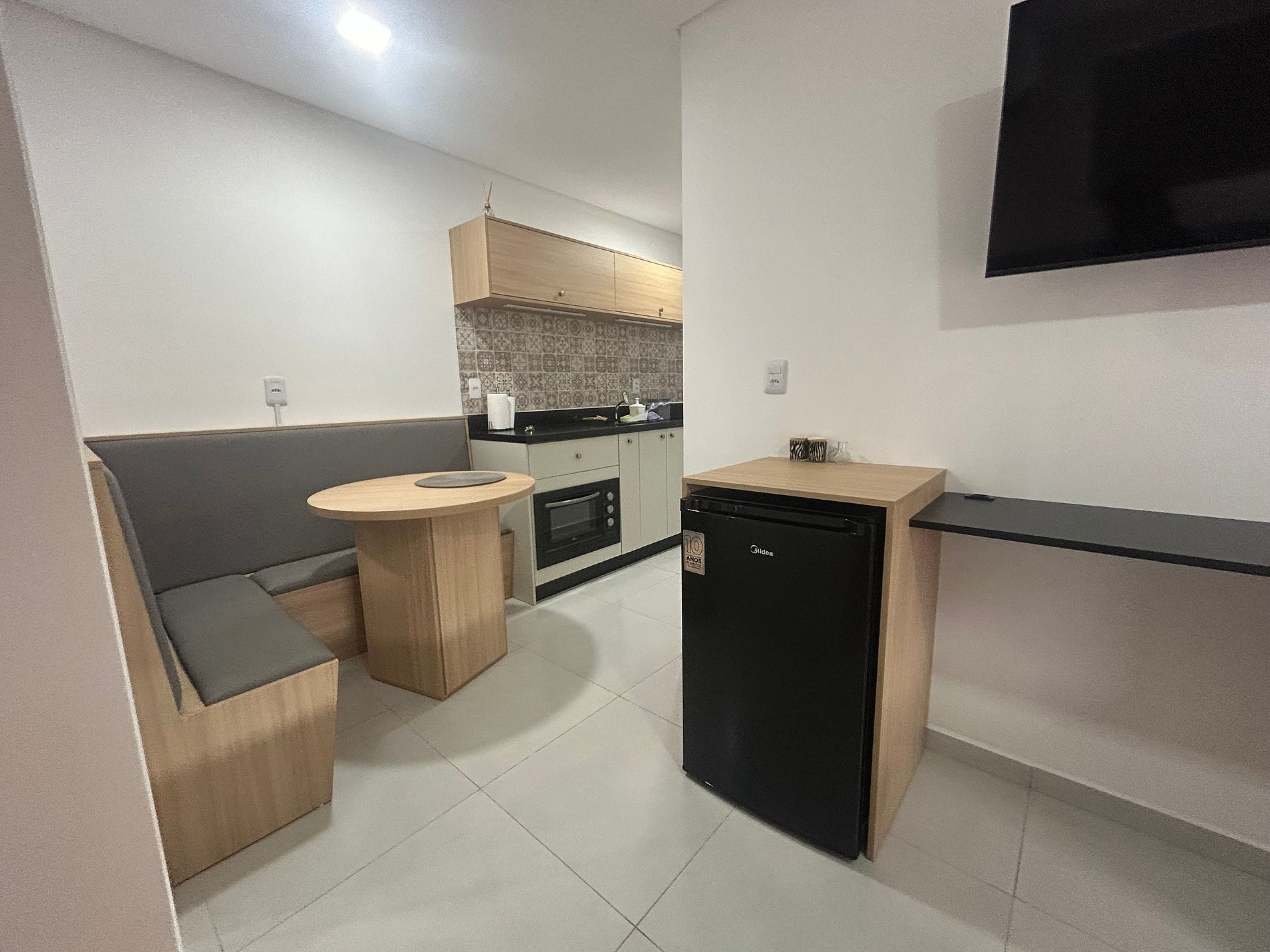 Este estudio totalmente equipado en Florianópolis combina funcionalidad y comodidad.