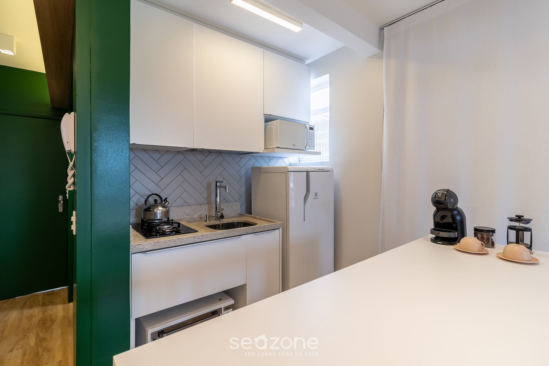 - Cocina compacta con nevera, cocina, horno, microondas, sandwichera, cafetera, tetera, licuadora, copas de vino, ollas, platos y utensilios;