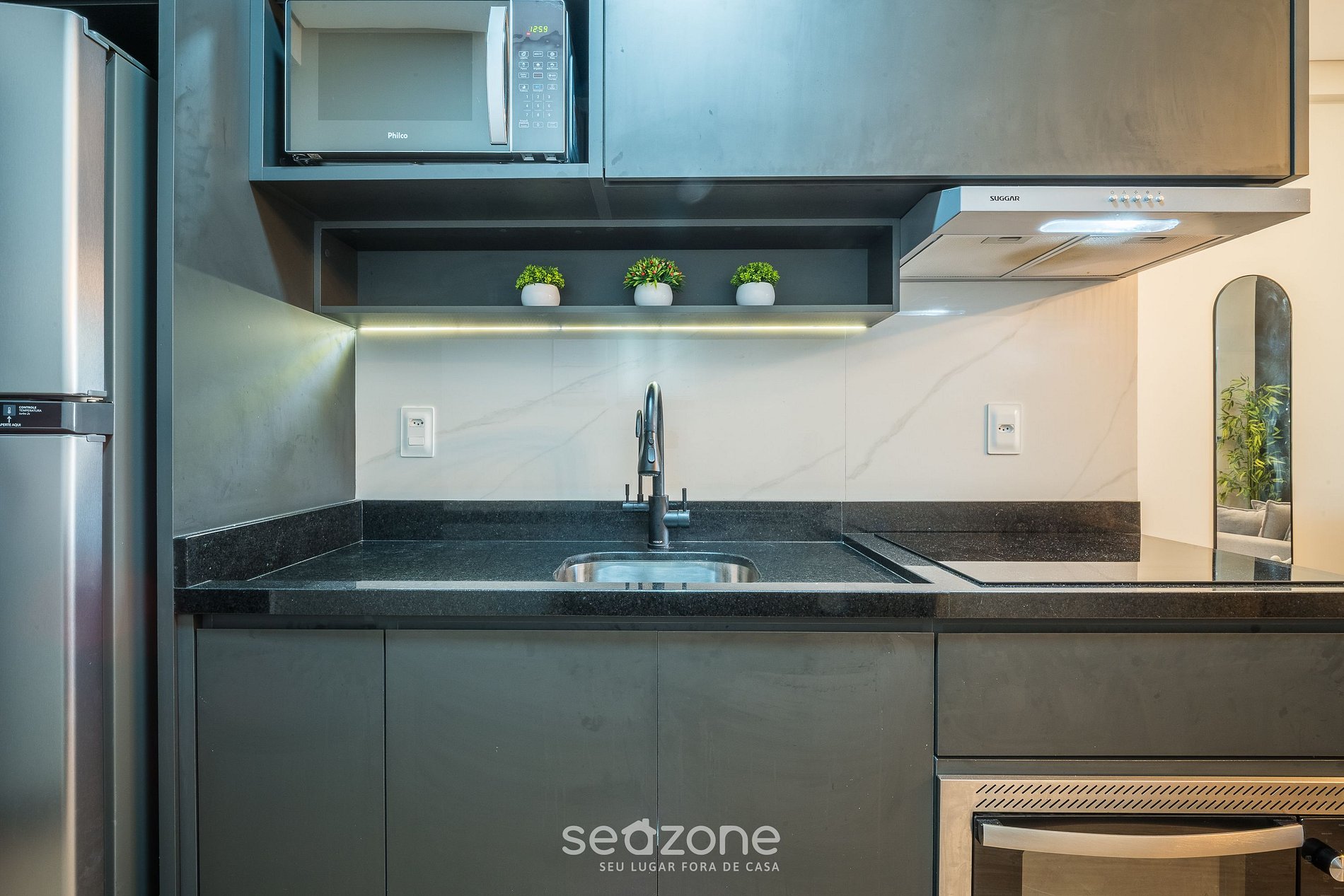- Cocina totalmente equipada con refrigerador, placa de inducción, horno eléctrico, microondas, sandwichera, cafetera eléctrica, hervidor eléctrico, licuadora, copas de vino, ollas, sartenes, platos y utensilios;