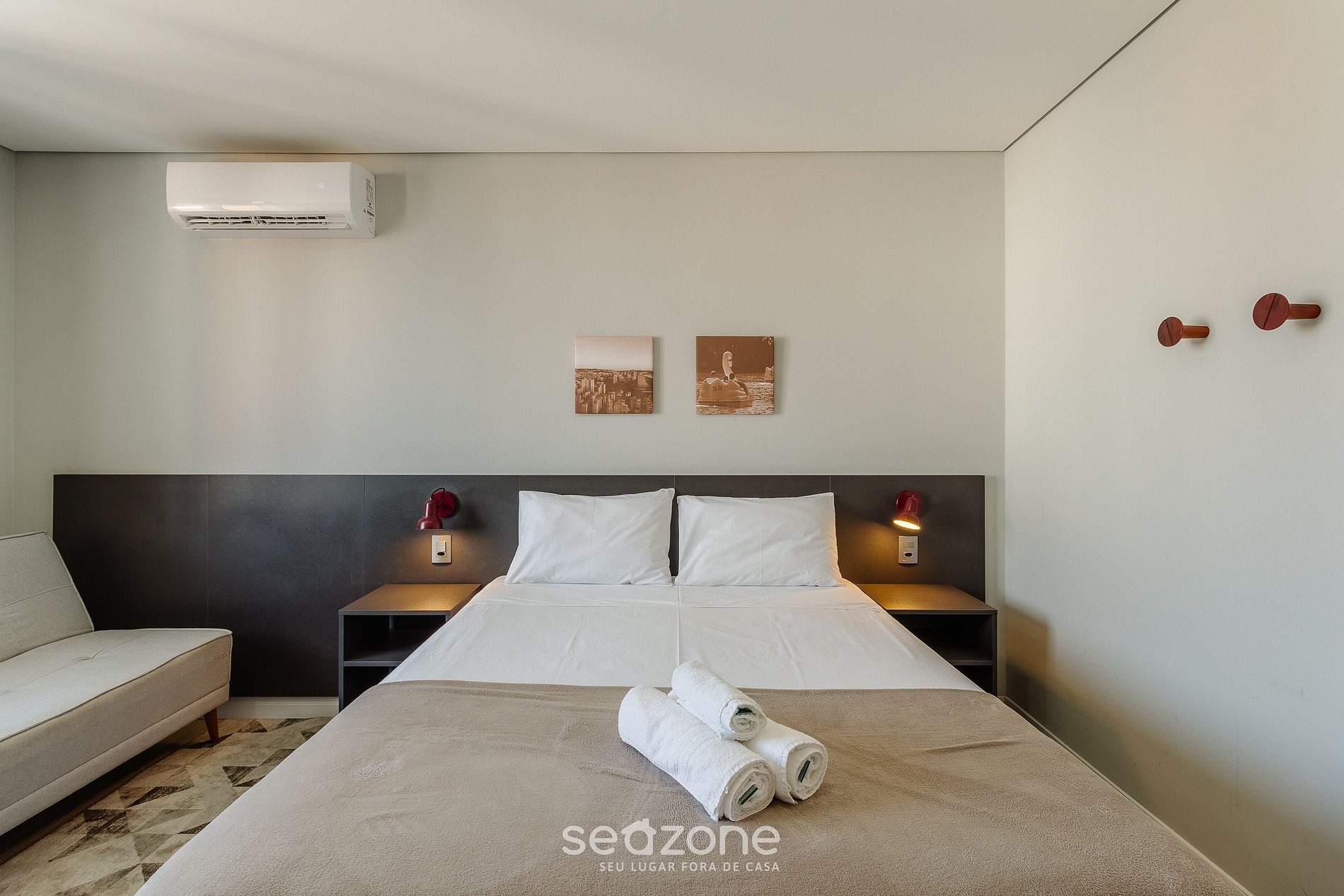 - Estudio con cama queen size, sofá, TV y aire acondicionado;