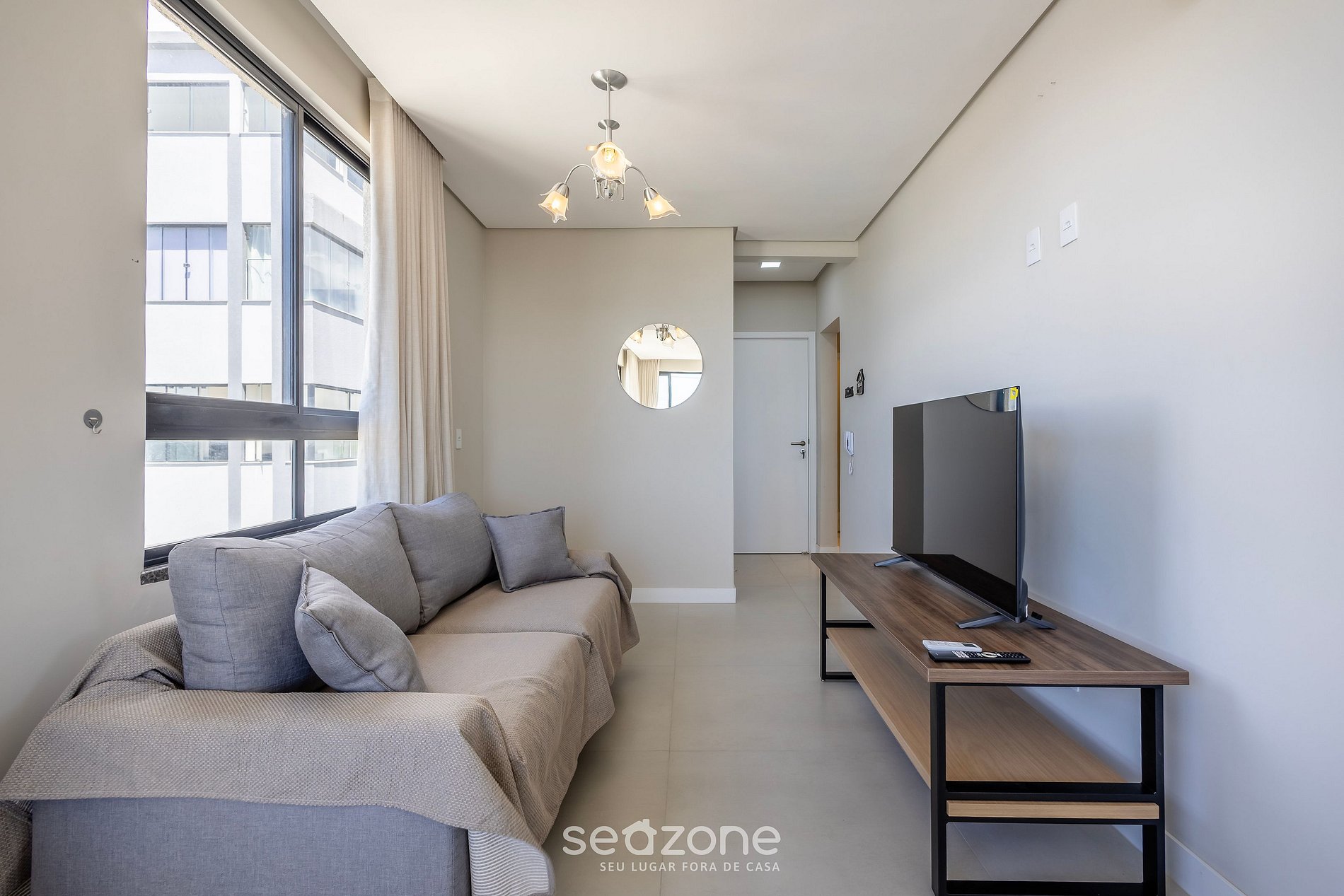 - Sala de estar con sofá, Smart TV, ventilador portátil y vistas al mar y a la ciudad;