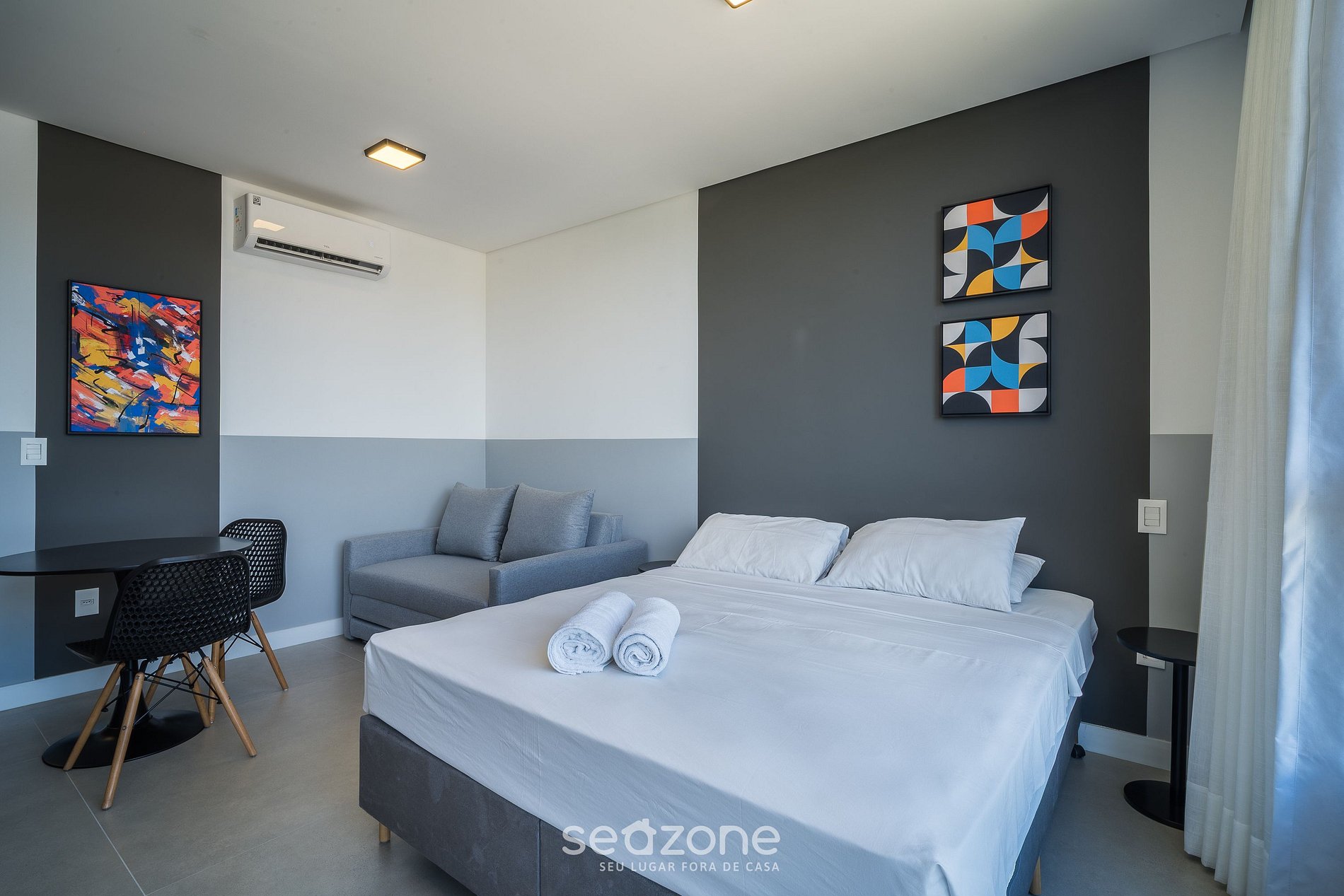 - Cama queen, sofá cama individual, perchero, Smart TV, espacio para laptop y aire acondicionado;