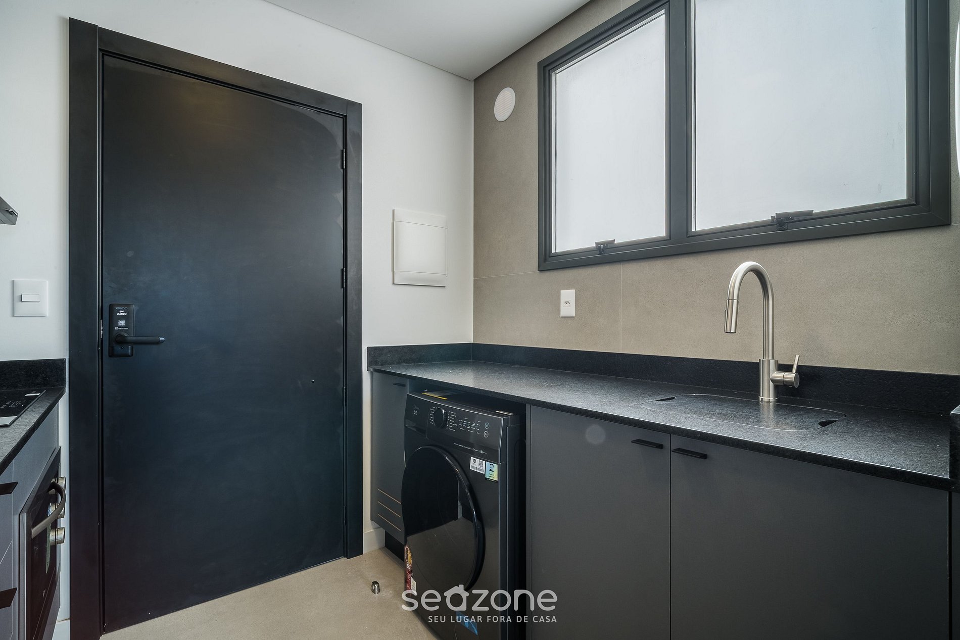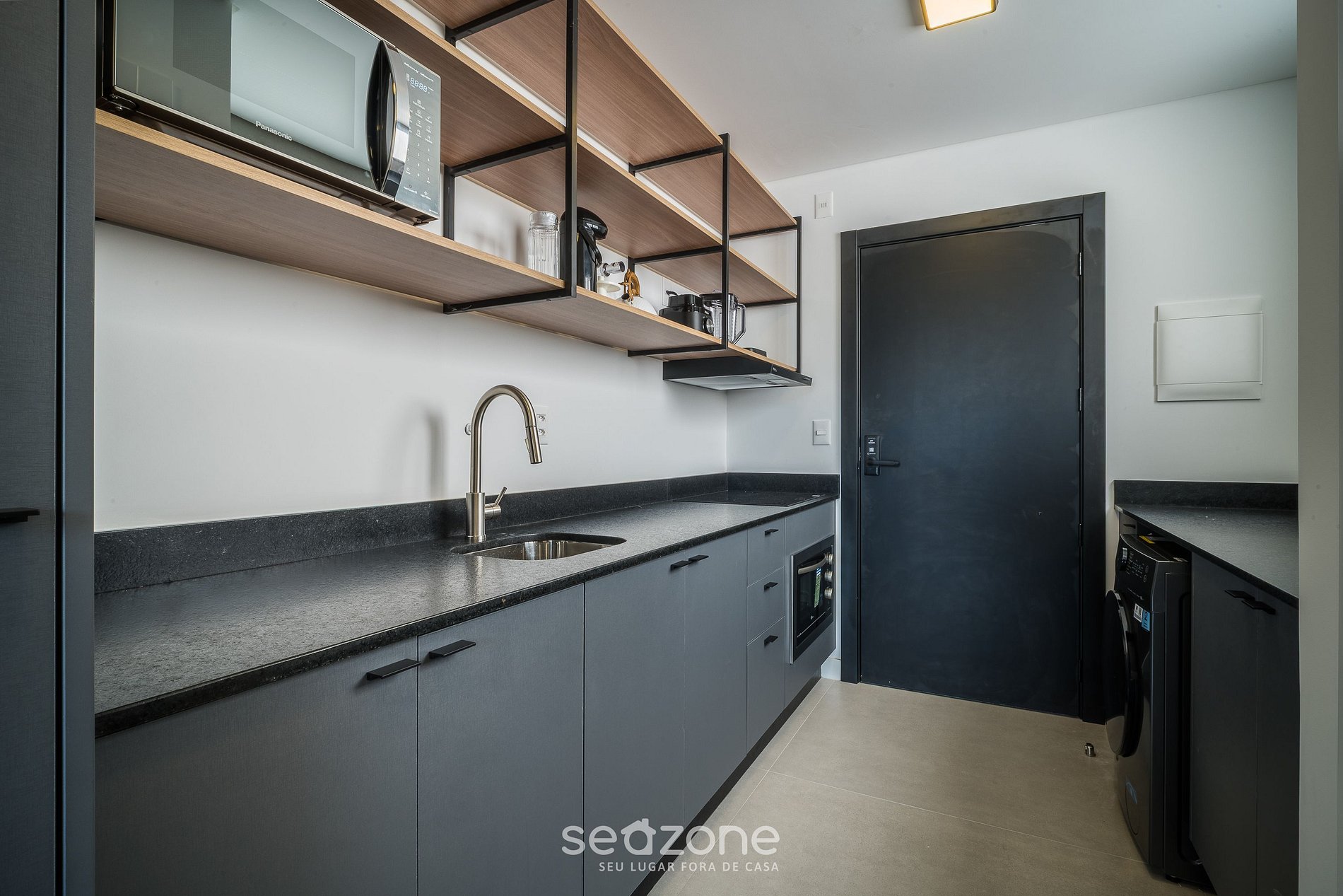 - Cocina totalmente equipada con refrigerador, placa de inducción, horno eléctrico, microondas, sandwichera, kit de café (portafiltro, termo), tetera, licuadora, copas de vino, ollas, sartenes, platos y utensilios;