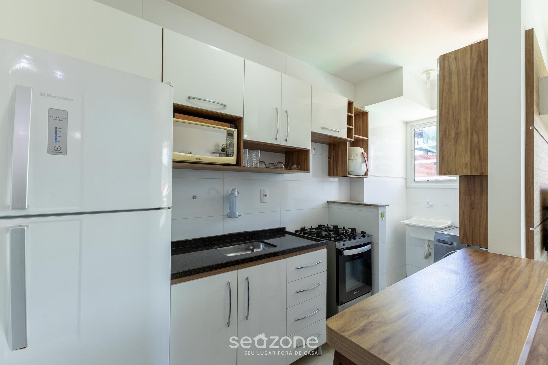 - Cocina totalmente equipada con refrigerador, estufa y horno de gas, microondas, sandwichera, kit de café (portafiltro, termo), freidora de aire, hervidor, licuadora, copas de vino, ollas, platos y utensilios;