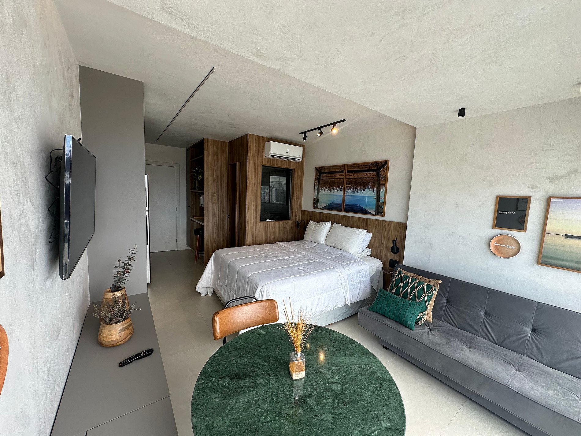 - Cama queen, Smart TV, sofá, armario y aire acondicionado;