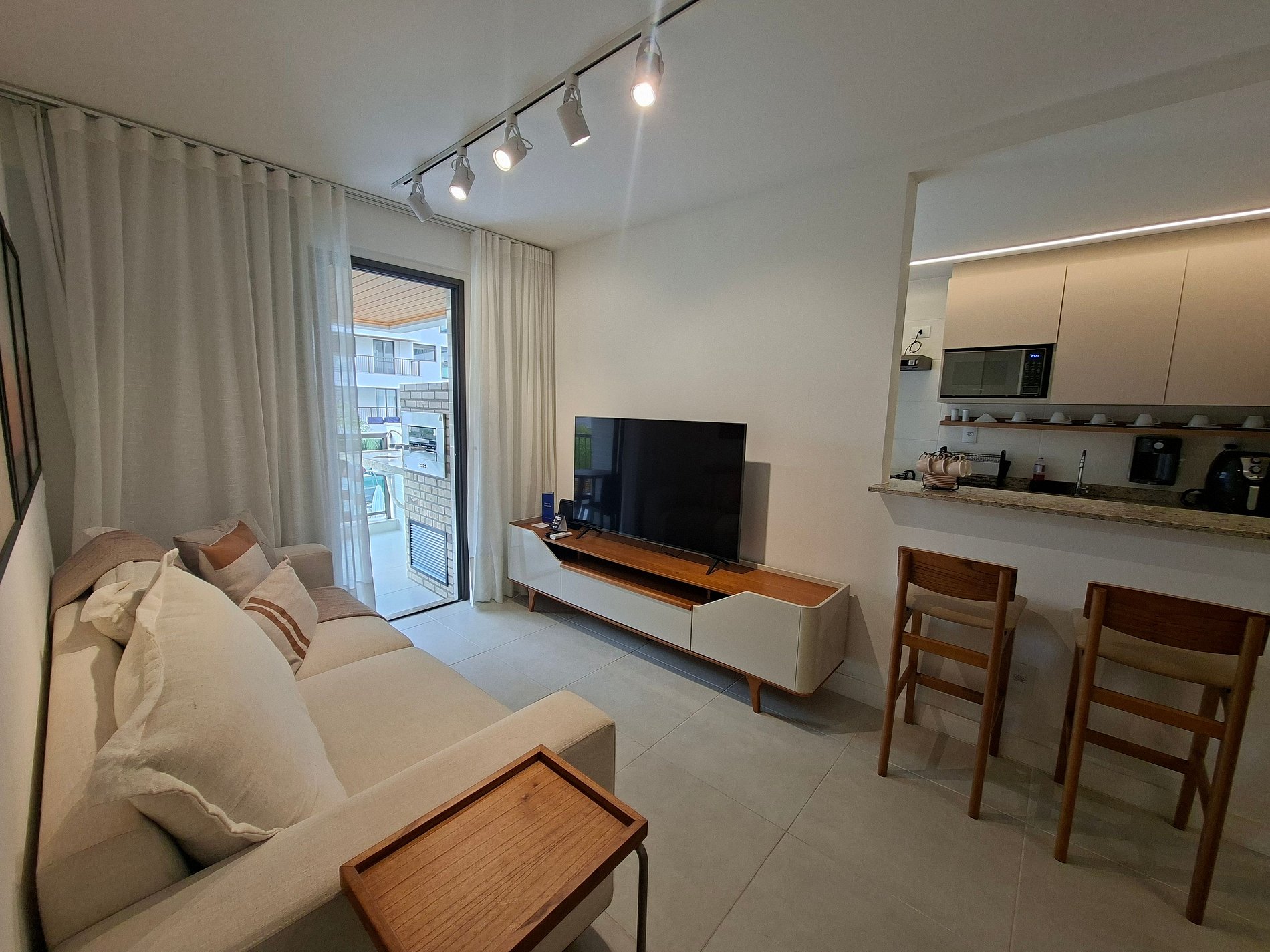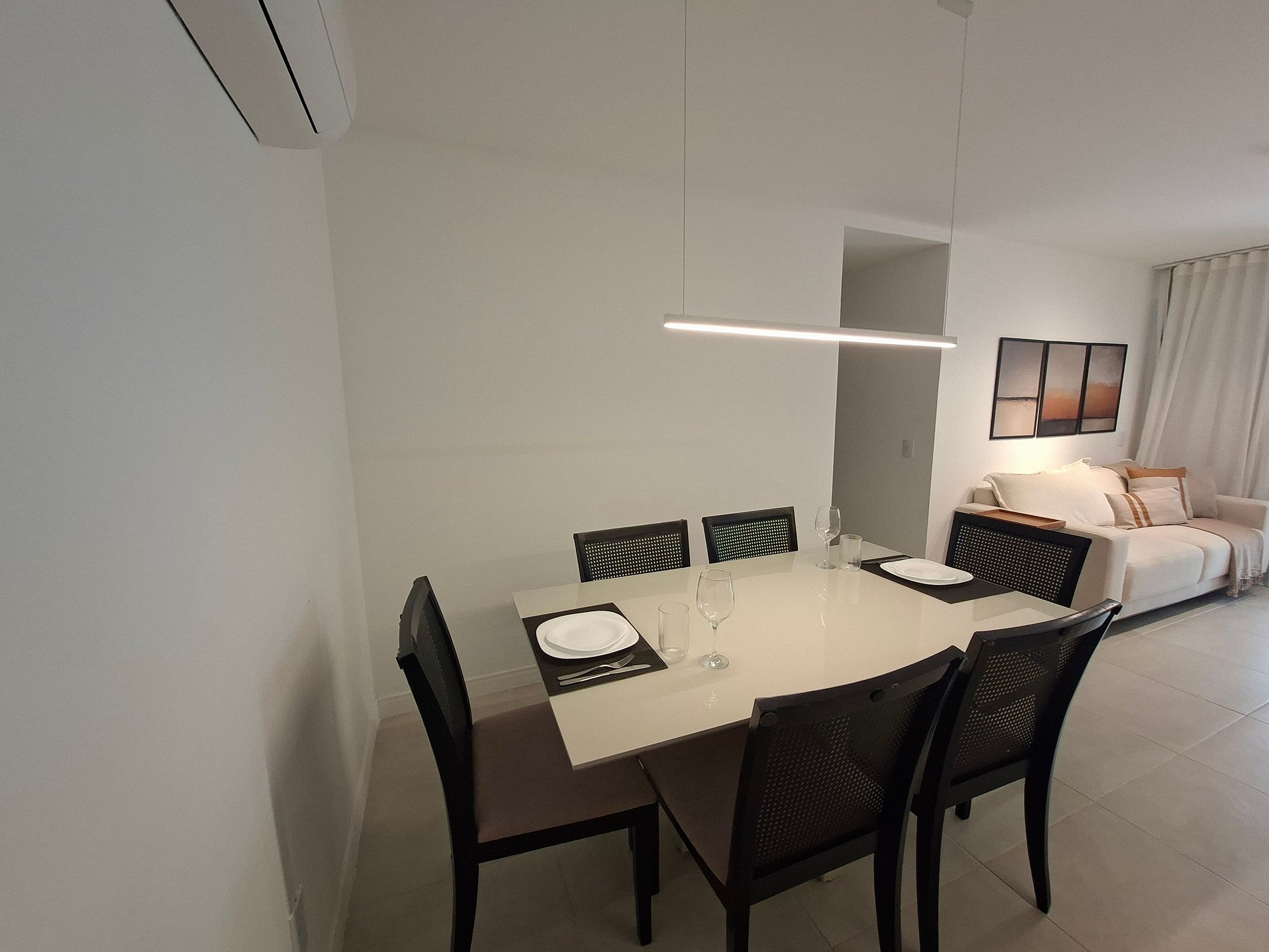 Sala de estar con sofá, Smart TV y aire acondicionado;