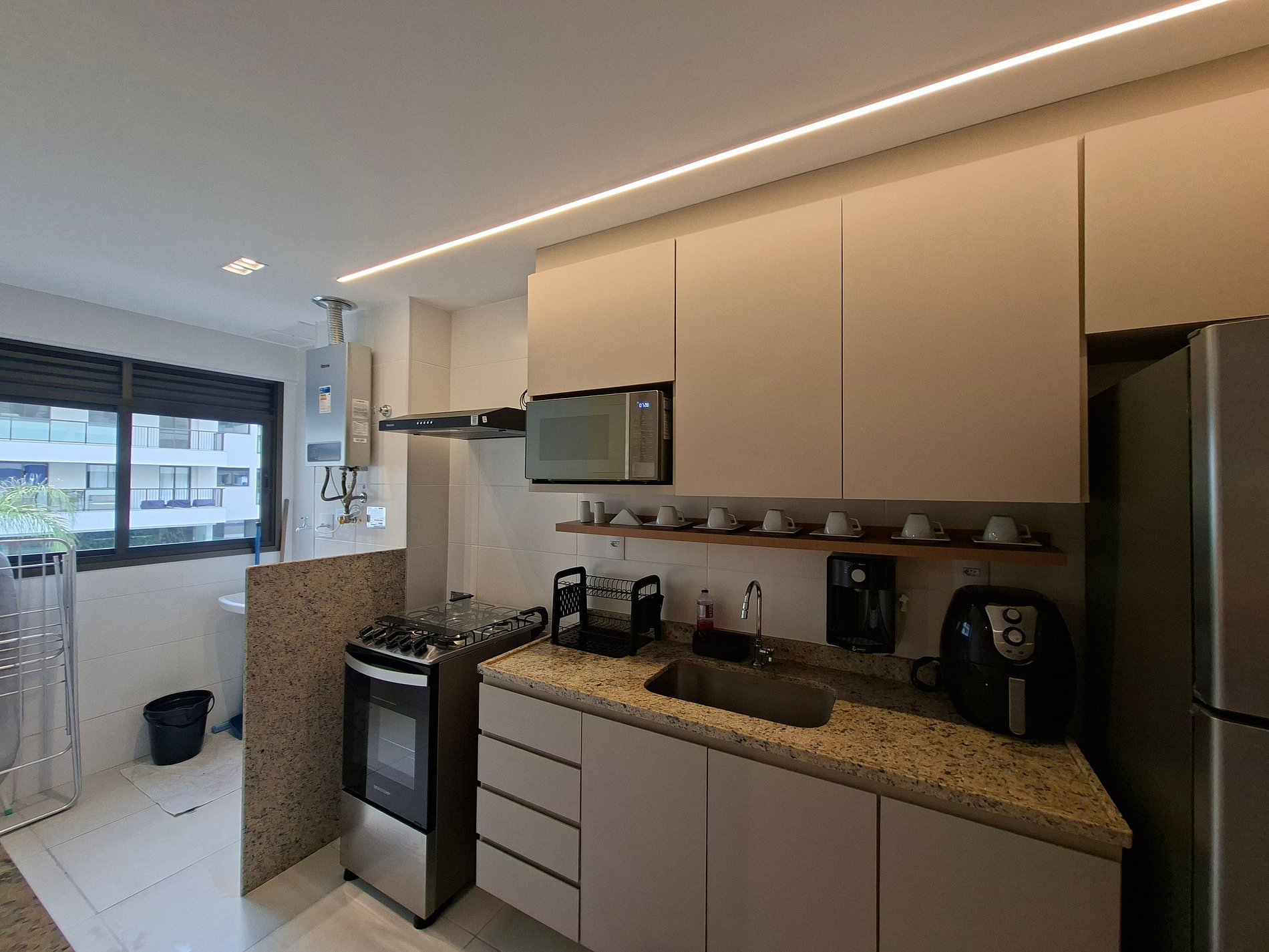 Cocina completa con refrigerador, cocina y horno a gas, microondas, airfryer, sandwichera, cafetera eléctrica, hervidor convencional, licuadora, copas de vino, ollas, vajilla y utensilios;