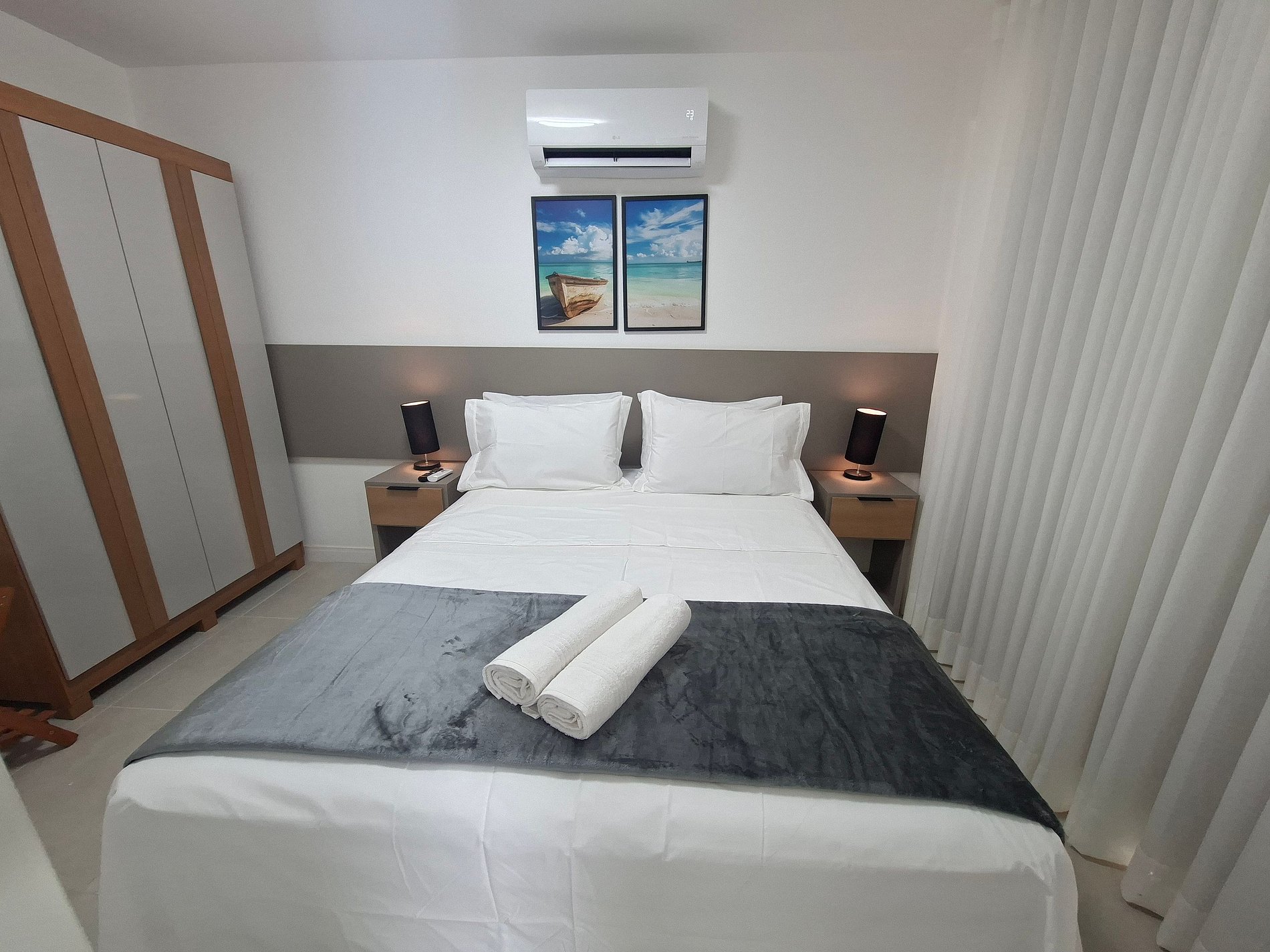 1 Dormitorio con cama matrimonial, armario y aire acondicionado;