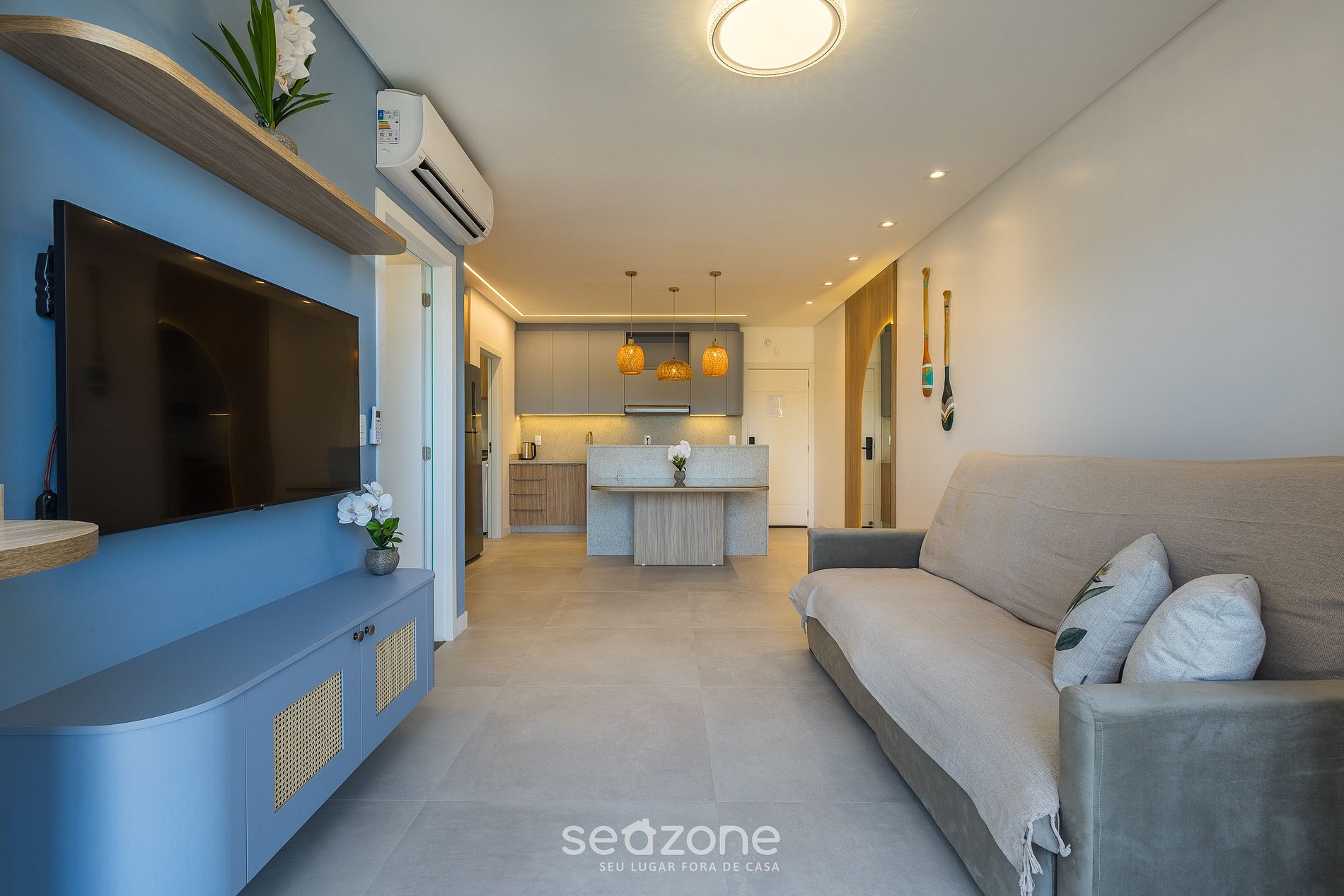 - Sala de estar con sofá, Smart TV y aire acondicionado;