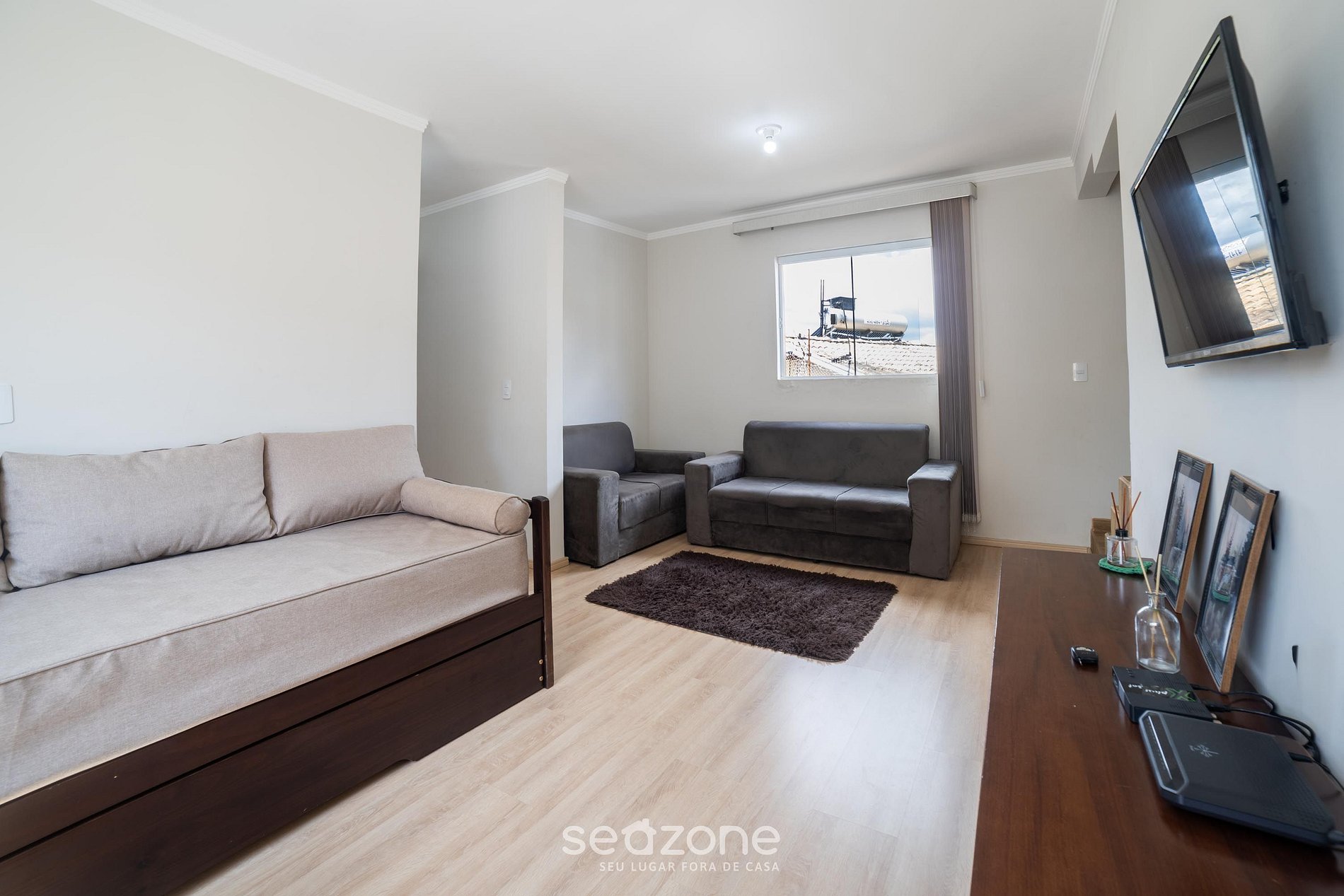 - Sala de estar con sofás, ventilador portátil y Smart TV;