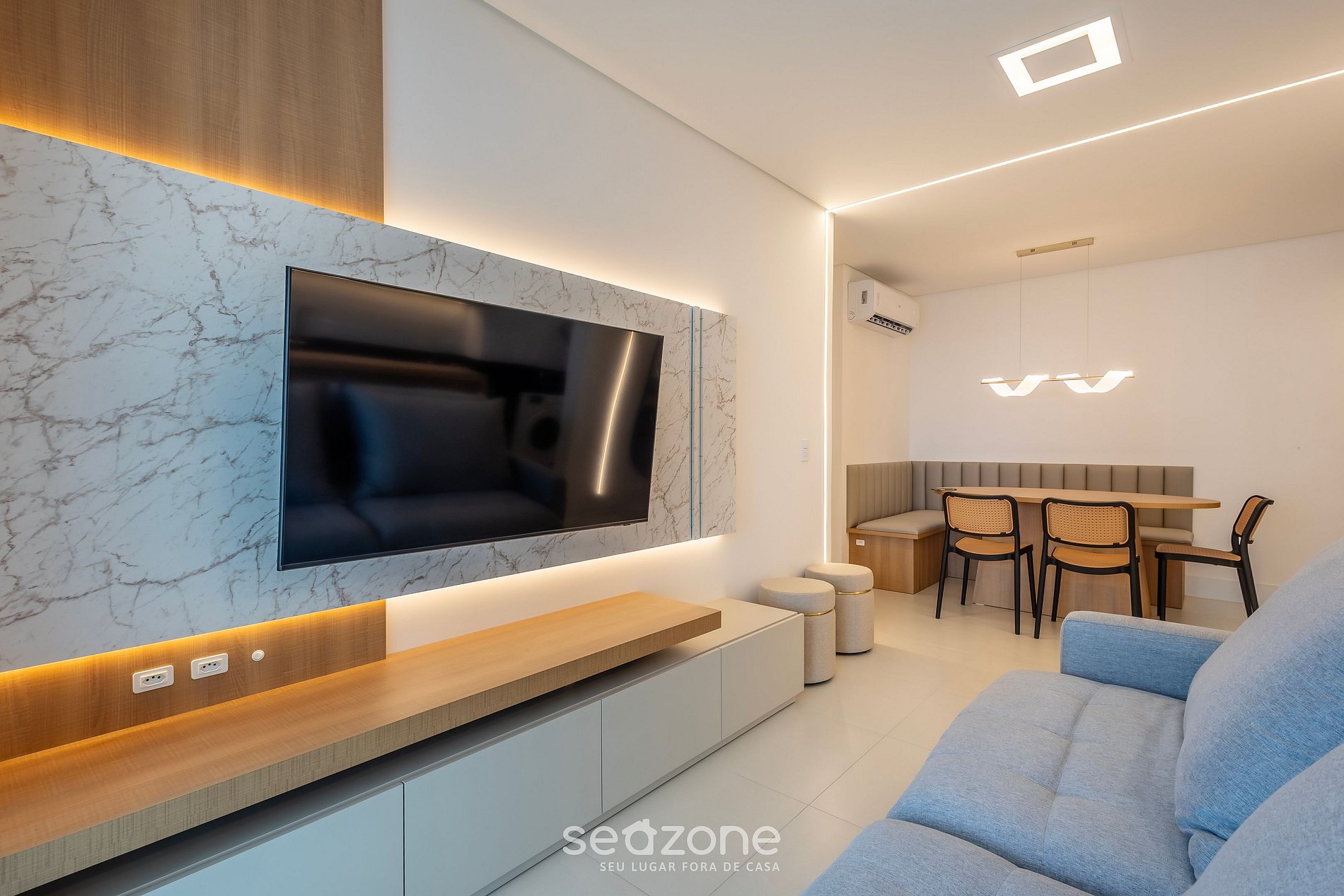 - Sala de estar con sofá, Smart TV y aire acondicionado;