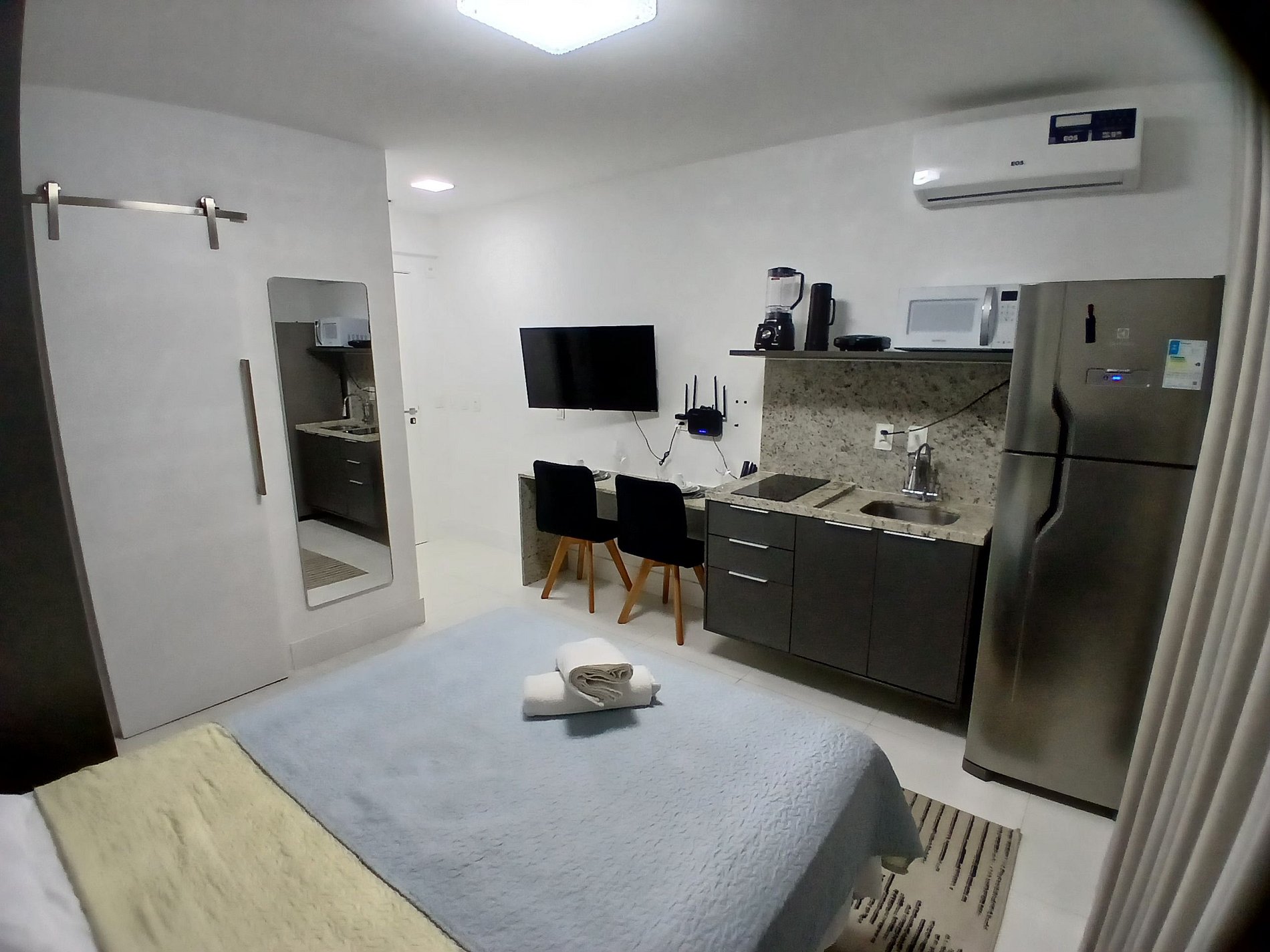 - Cocina completa con refrigerador, congelador, microondas, anafe de inducción, licuadora, sandwichera, kit de café (soporte para filtro y termo), ollas, vajilla y utensilios;