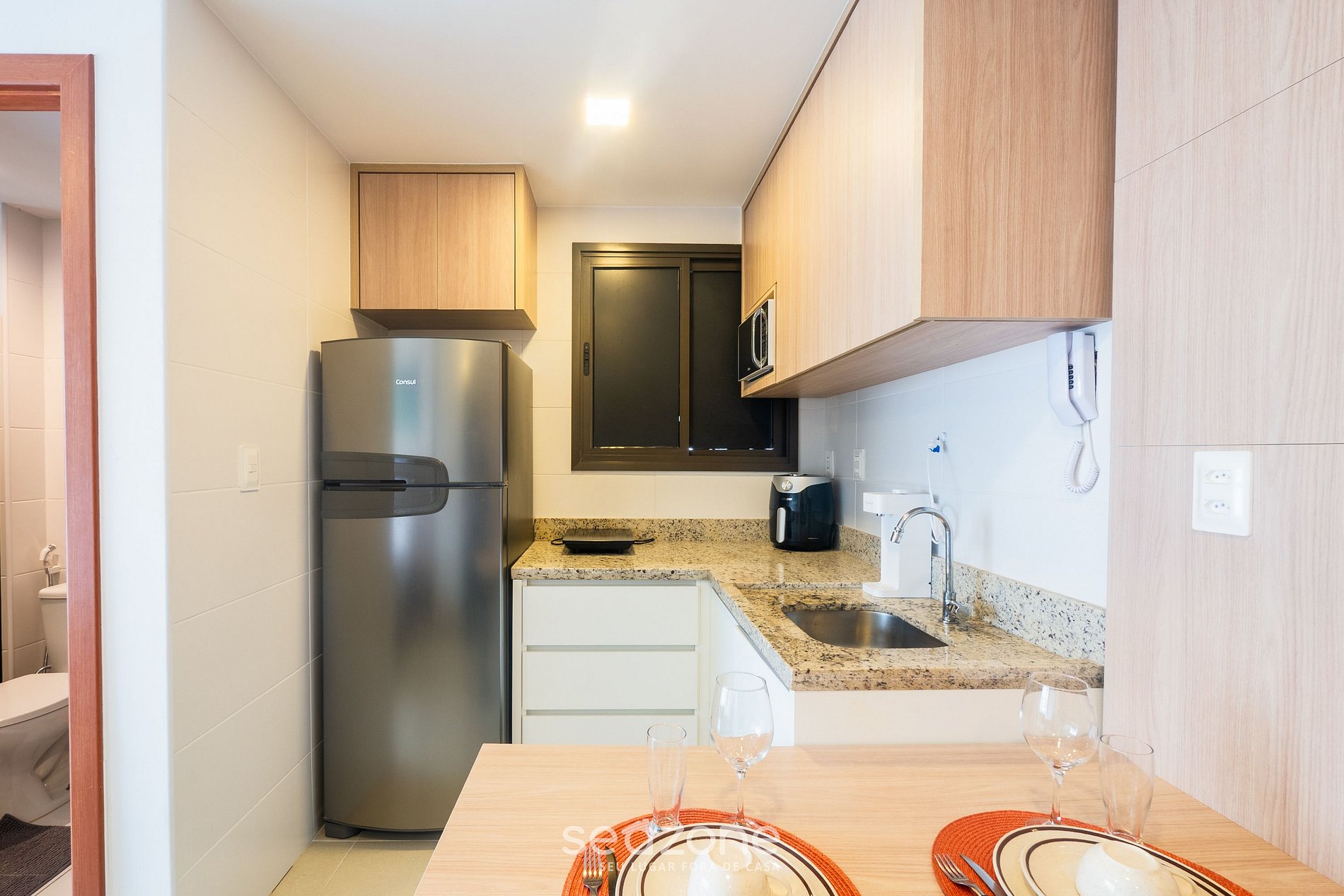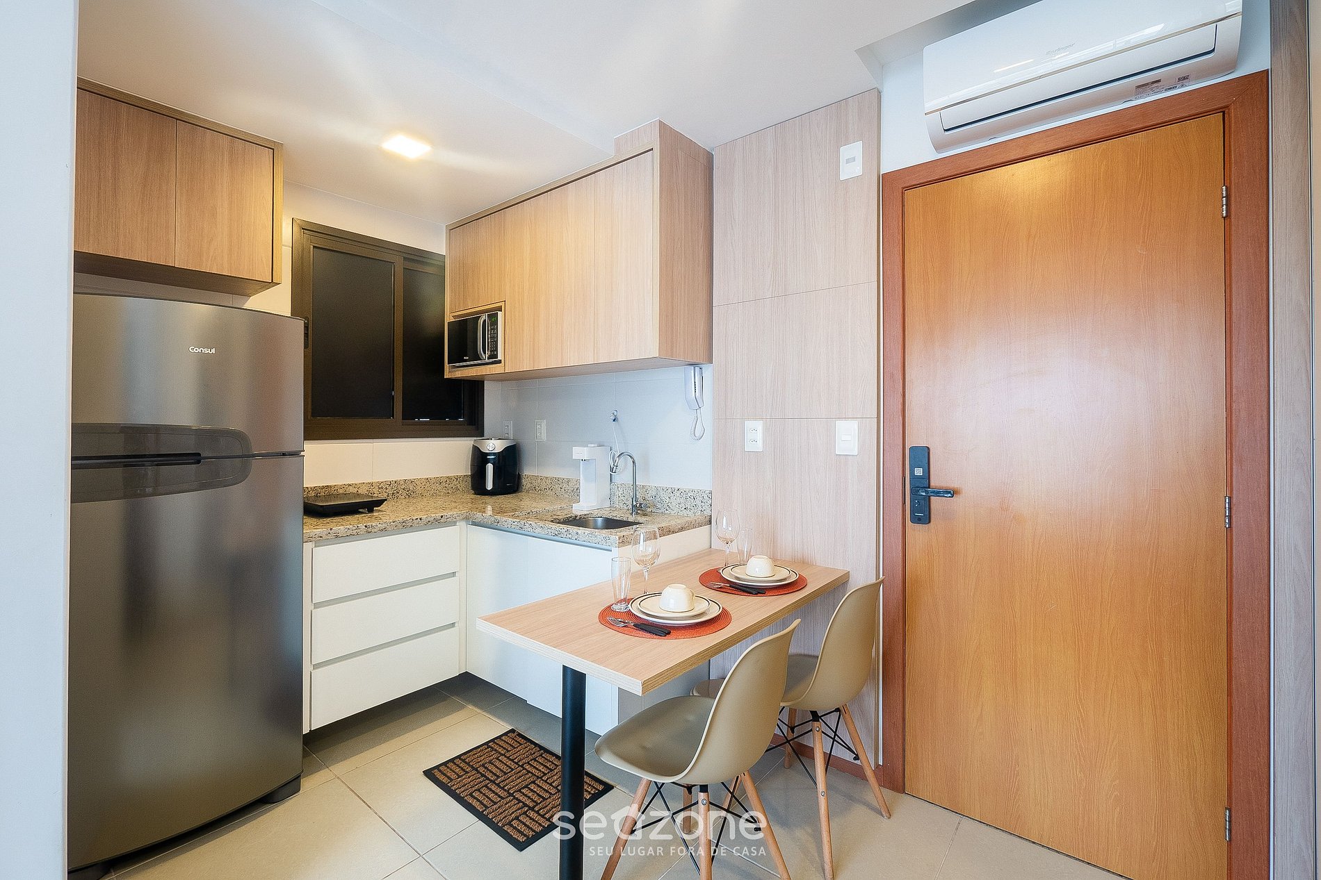 - Cocina totalmente equipada con refrigerador, placa de inducción, microondas, freidora de aire, sandwichera, kit de café (soporte y termo), hervidor eléctrico, licuadora, copas de vino, ollas, platos y utensilios;