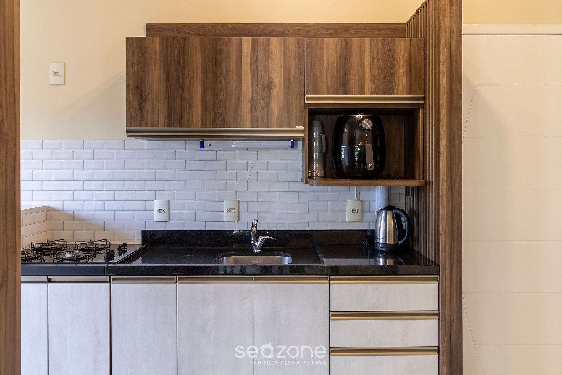 - Cocina completa con nevera, estufa cooktop, sandwichera, kit de café, tetera, licuadora, airfryer, copas de vino, ollas, vajilla y utensilios.