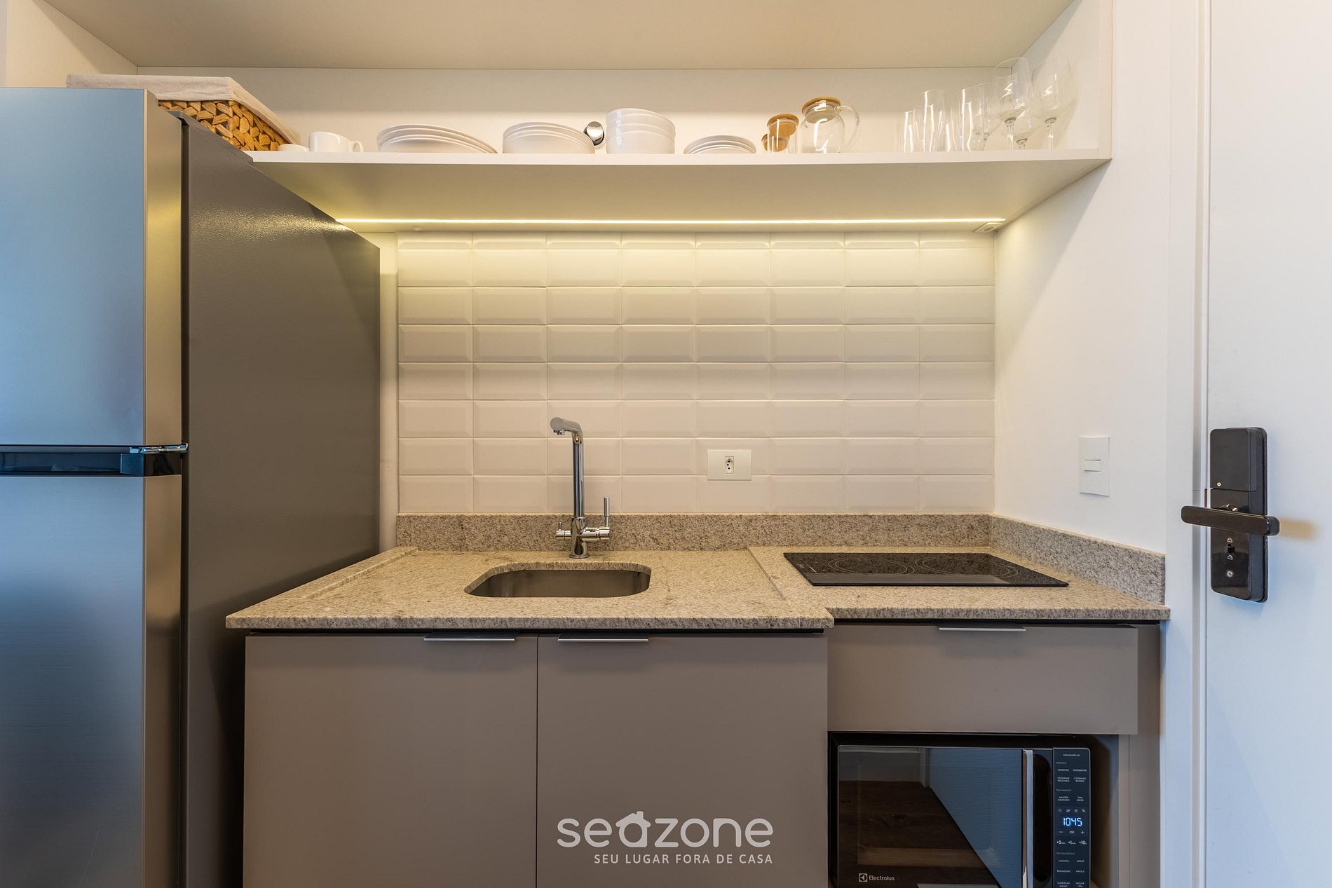 - Cocina totalmente equipada con refrigerador, placa de inducción, microondas, sandwichera, cafetera eléctrica, hervidor eléctrico, licuadora, copas de vino, ollas, sartenes, platos y utensilios;