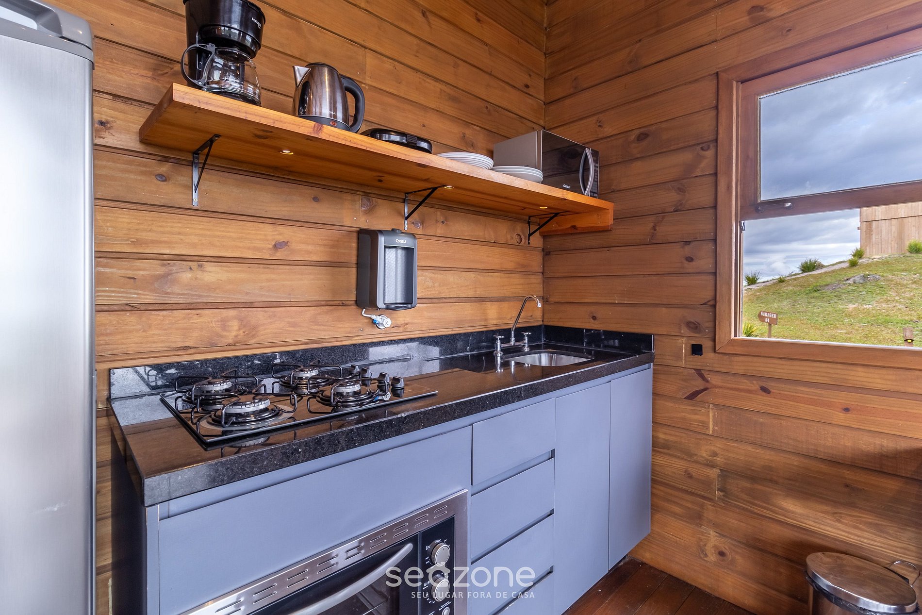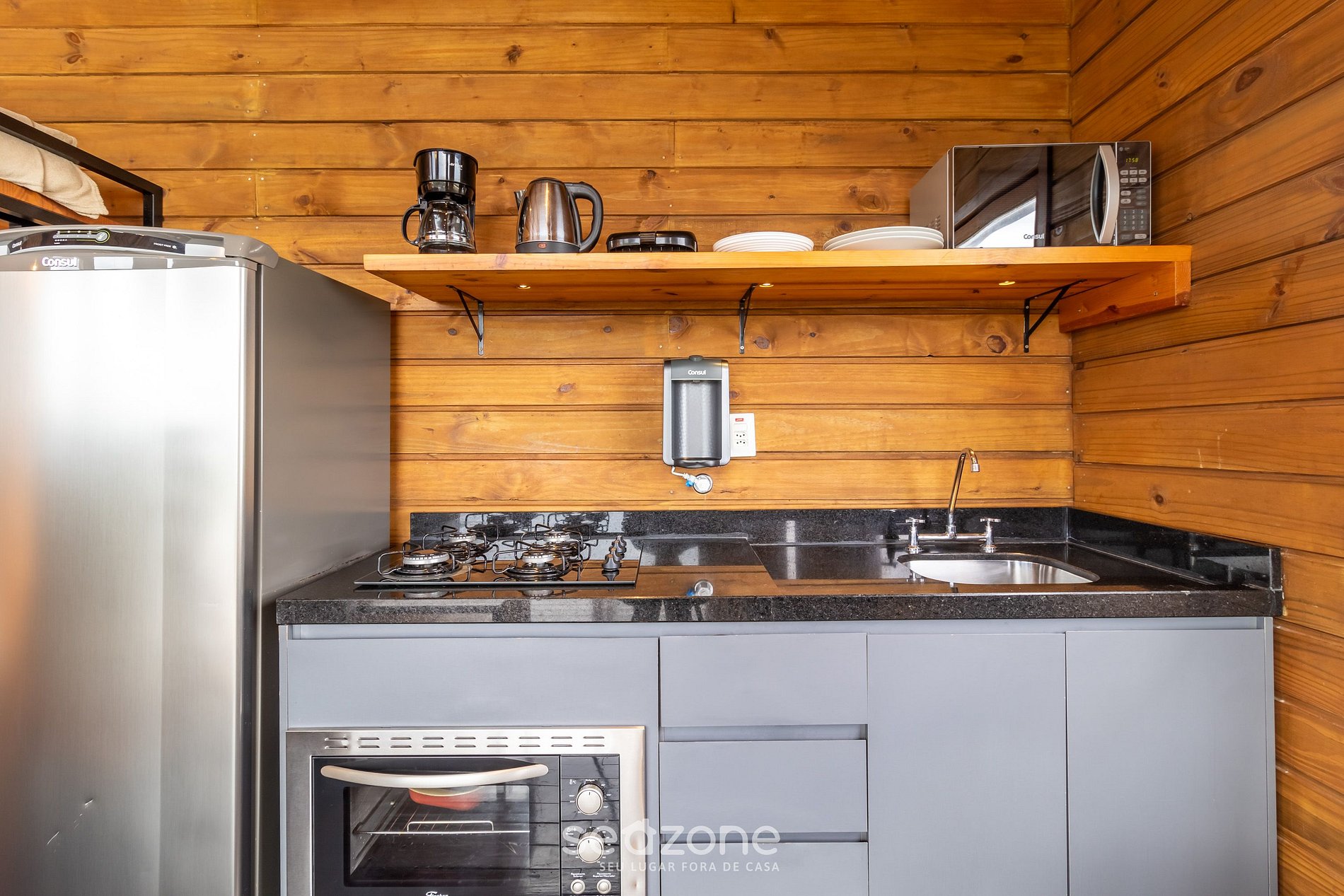 - Cozinha perfeita para dois, com geladeira, fogão cooktop, forno elétrico, filtro de agua, liquidificador, sanduicheira, cafeteira, chaleira elétrica, panelas, louças e utensílios diversos (sal, óleo, etc);