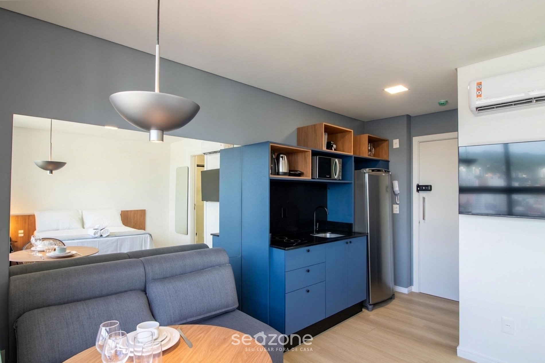 - Cama doble, Smart TV, sofá, armario y aire acondicionado split;