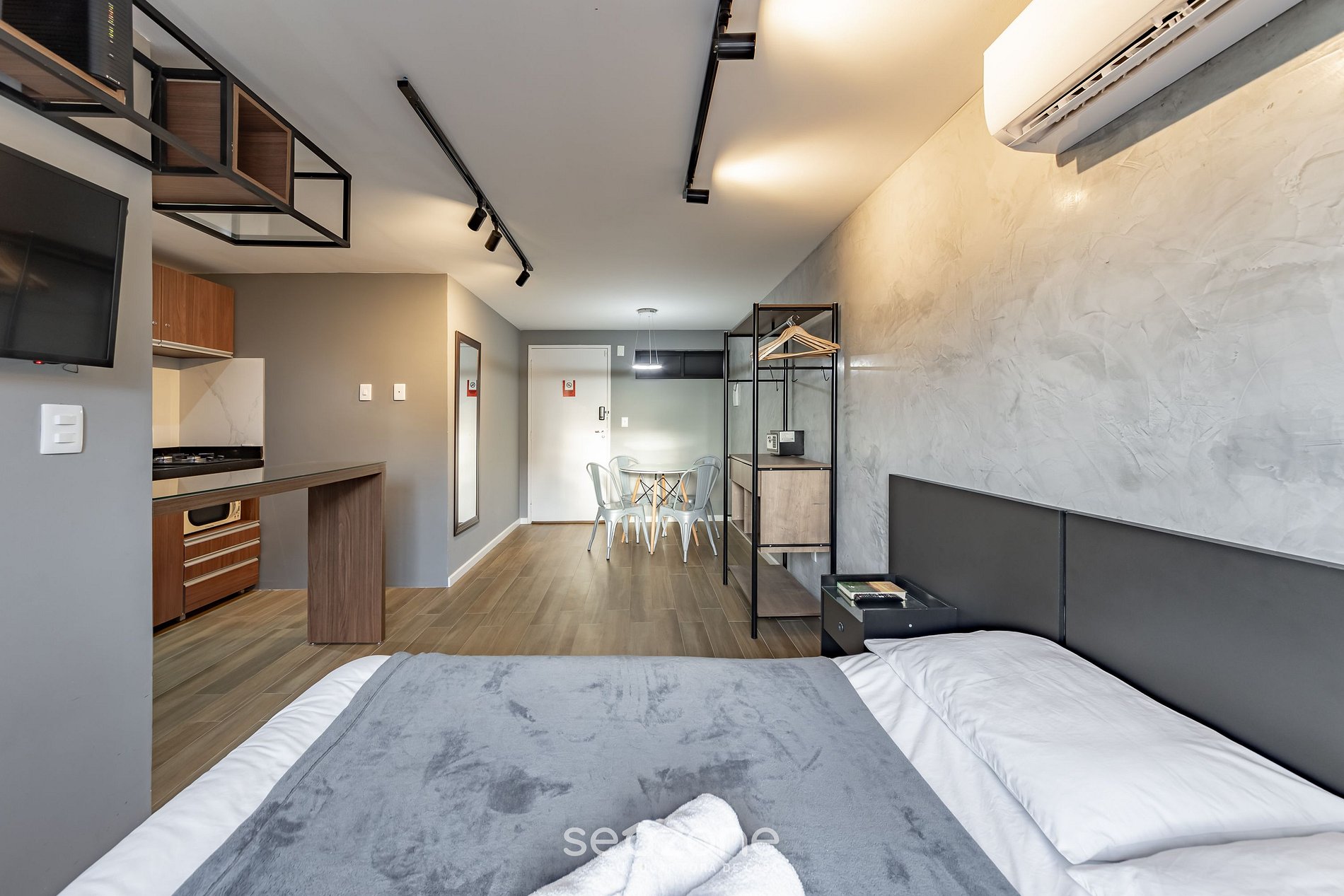 - 1 cama doble, Smart TV de pantalla plana, cortinas, perchero y aire acondicionado;
